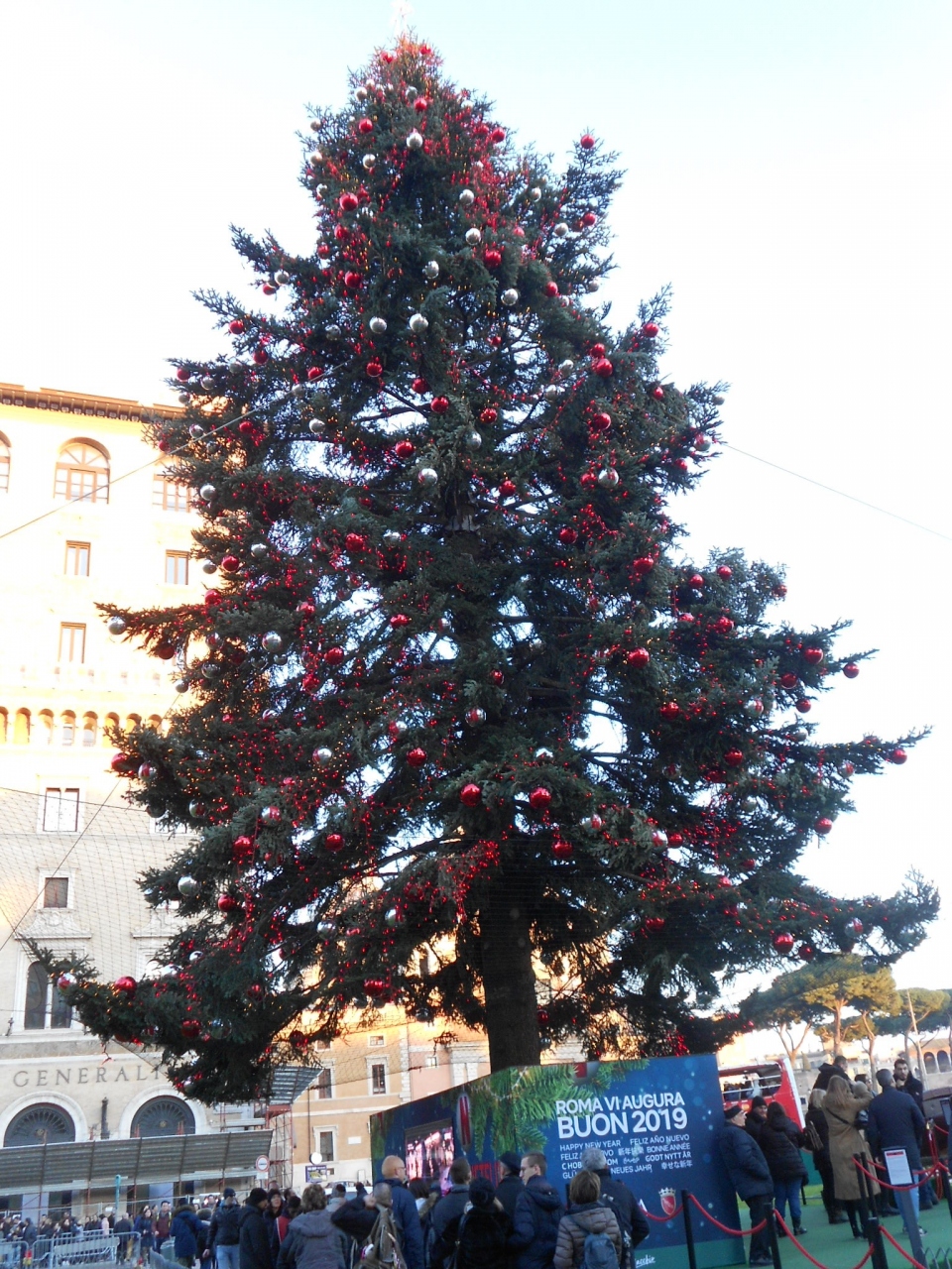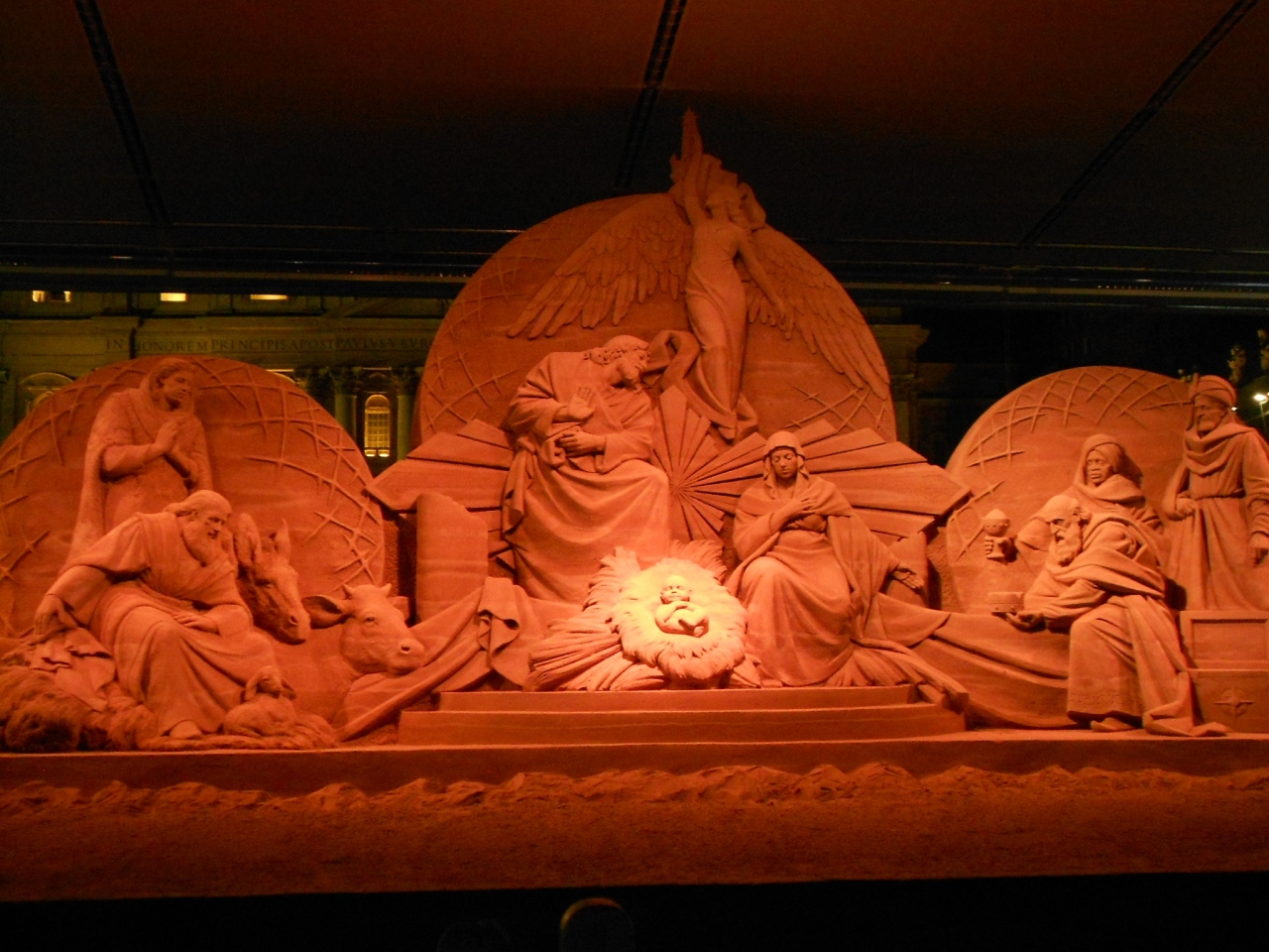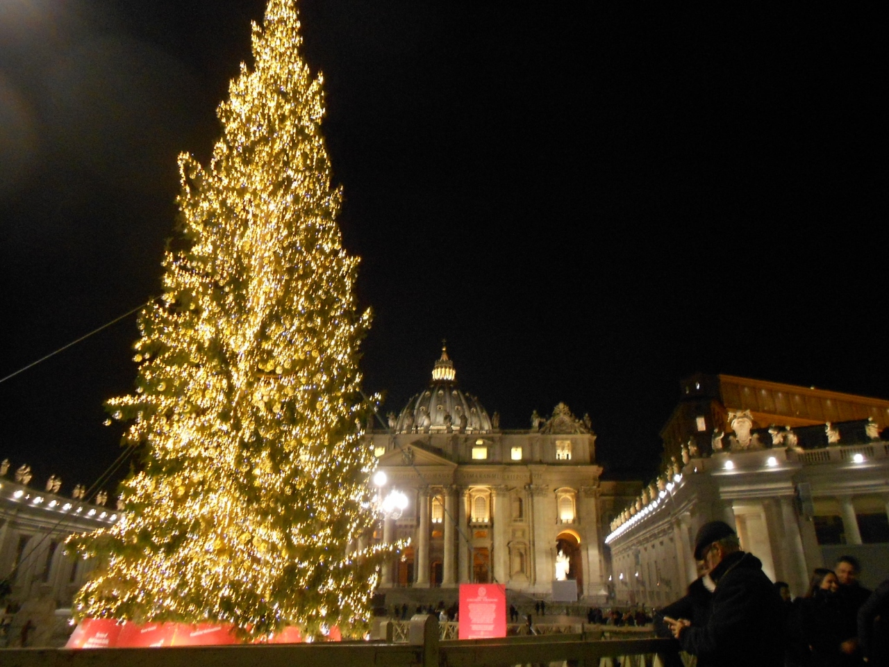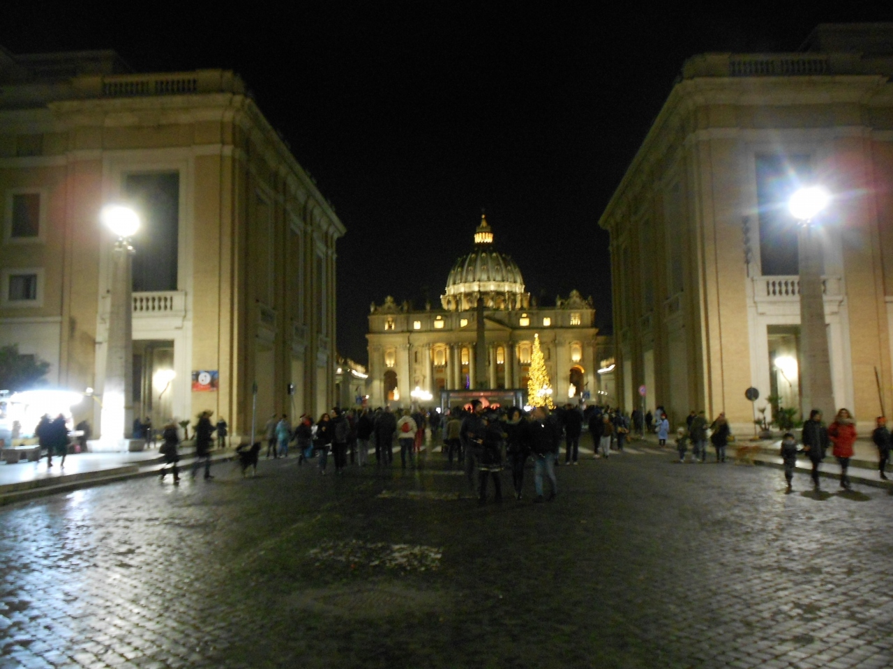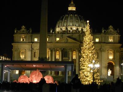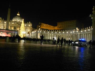 12月末に訪れました。広場中央に立つと暗闇に浮かび上がるサン・ピエトロ大聖堂。繊細な光のライトアップ、その美しさに目を奪われます。オベリスクの隣にはクリスマスツリーとキリスト生誕の様子を表した大きなモニュメントが設置されていました。大聖堂の両サイドは半円形の真っ白な列柱が立ち並ぶ美しい回廊があって、大聖堂との構図が美しすぎです。この時期ならではの大きなイルミネーションのクリスマスツリーがとっても綺麗でした。