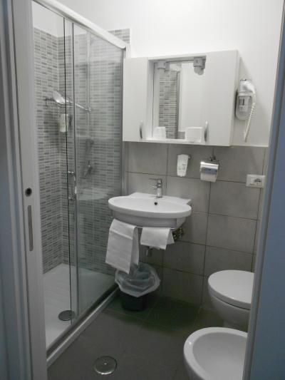 バスルームも新しくきれい。ガラスのシャワーブースでハンドシャワーもあり熱いお湯もたっぷり。