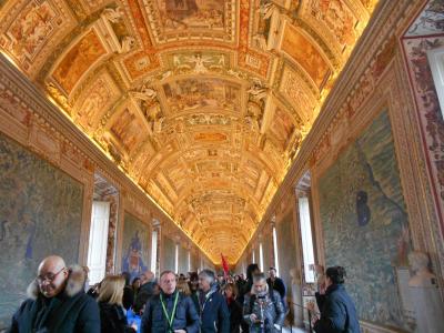 毎月最終日曜は入館無料の日。年末にローマ滞在だったので、はじめてのバチカン美術館の見学に行ってきました。この日の開館時間は9時~14時。8時頃リソルジメント広場へ行くと既にすごい行列!並び始めて1時間半で入場できました。入口でセキュリティチェック有。主な見学は地図のギャラリー、ピウス5世の部屋、ラファエロの間4室。最後にシスティーナ礼拝堂へ入るとすごい人!写真撮影は不可です。天井壁面すべてがフレスコ画で埋め尽くされ圧倒されました。ミケランジェロの天井画 、壁面の「最後の審判」は圧巻の素晴らしさでした。館内は本当に広く一方通行も多く迷路のような見学コースで、システィーナ礼拝堂は一番奥にあるので到達した時には疲労困憊。今度行く機会があったら攻略法が必要と思いました。螺旋階段をぐるぐる降りて出口へ。上から見た螺旋階段はとても素敵でした!滞在時間は10時から2時半までの4時間半。月一で無料で見学させてくれるバチカン市国、太っ腹ですね。