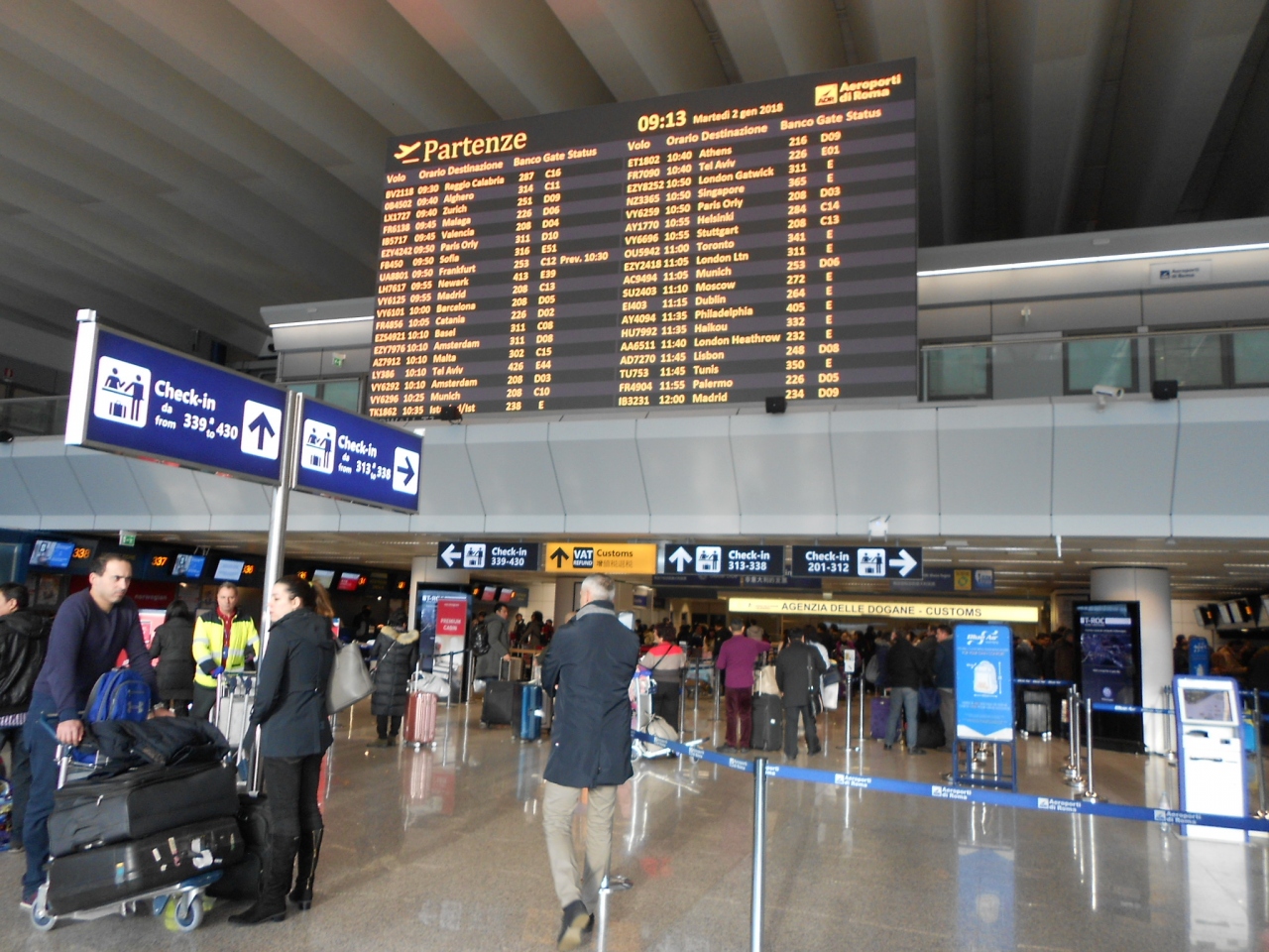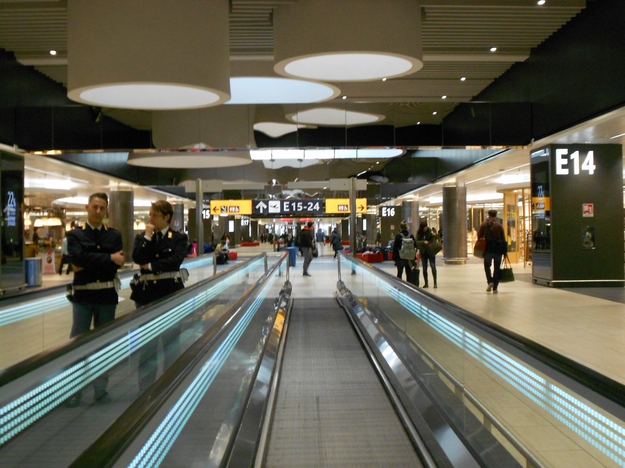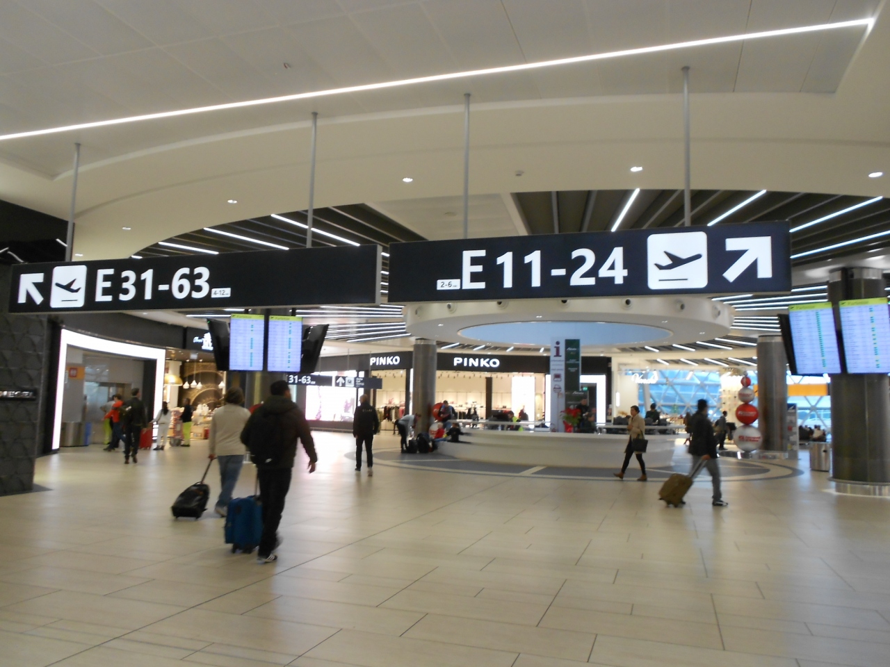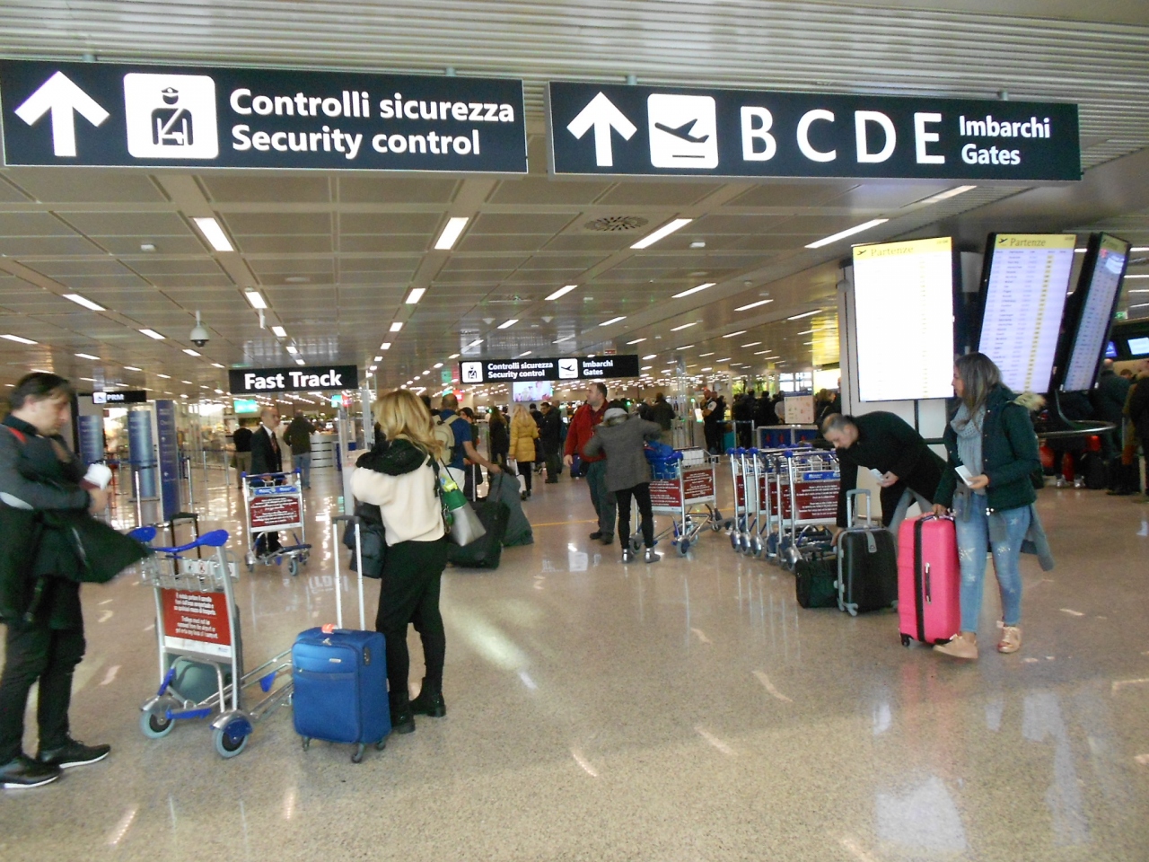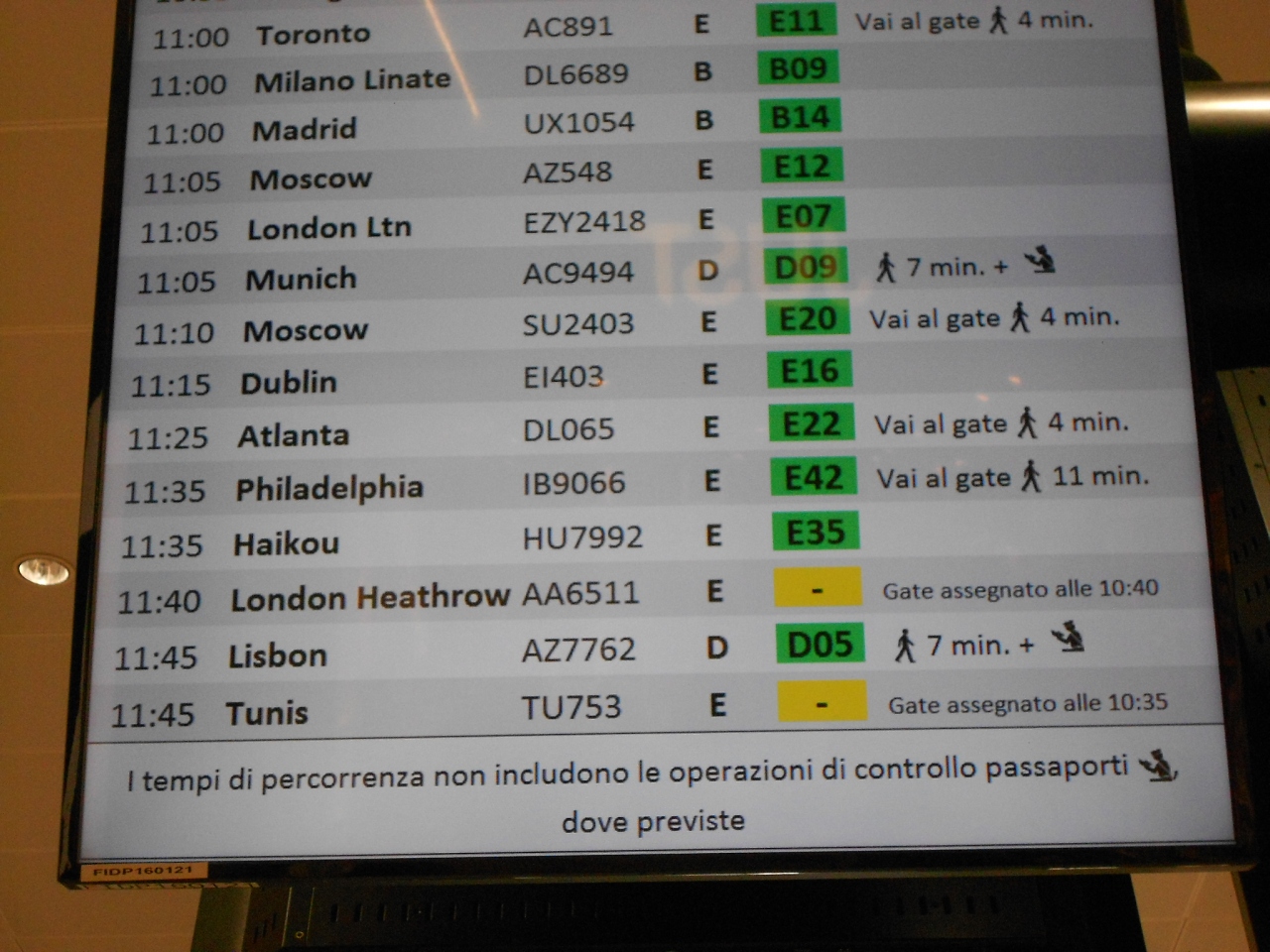 到着1時間50分遅れ!離陸時は2時間30分遅れだったので40分早く着いた!乗継便は20:15発なのでフライトまであと50分。なんとか間に合いそう!良かった!今回はターミナル直結で、飛行機から出ると空港スタッフが「ROME」と書かれた紙を掲げて出迎えてくれていました!5、6人集まったところで客のみで乗り継ぎカウンターへ行くよう指示されて進みましたが、メチャ混みでとても割り込むことが出来ずに並んでいると先ほどのスタッフが残りの客を連れてきて優先通過(19:50)。その後手荷物検査を通過しターミナルDに出て搭乗Gate7までは徒歩5分でした。20:00頃、搭乗口からバスに乗って沖停めの飛行機へ。この時点でフライト15分前、なんとか飛行機に乗り込むことができました。飛行機が着陸してから乗り換えゲートに到着するまで、優先通過でも40分かかりました。