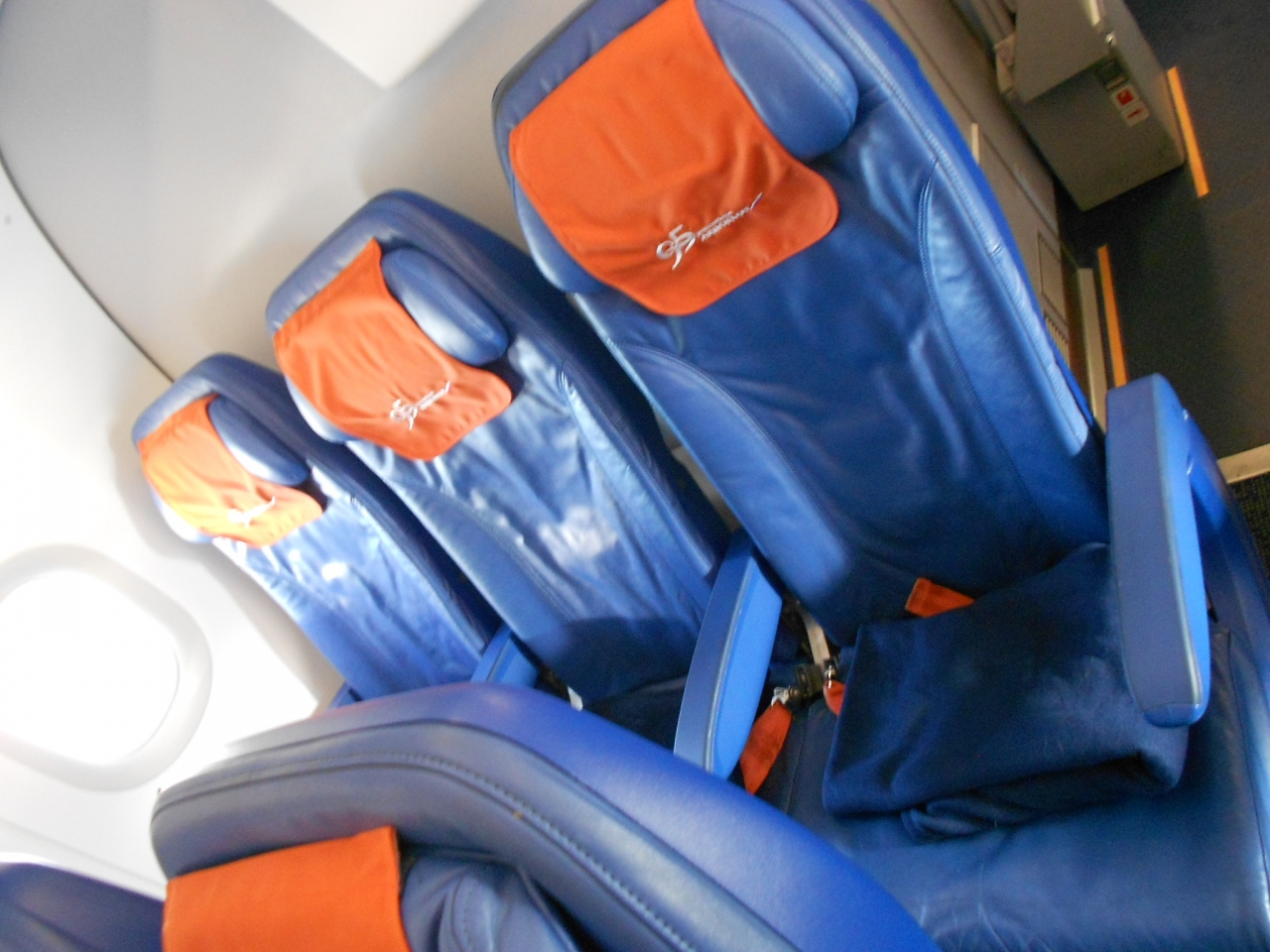 チェックインは2時間前の5:25から。カウンターの手前に自動チェックイン機がずらっとたくさんあって、やってみると座席は選べず自動的に座席が割り振られた搭乗券が出てきました。見ると通路側の座席だったのでカウンターで窓側の席に替えてもらいました。搭乗ゲートを入ると滑走路に出て目の前に機体が!なんと、直にタラップを登り飛行機に乗るスタイル!旅のワクワク感が高まります。