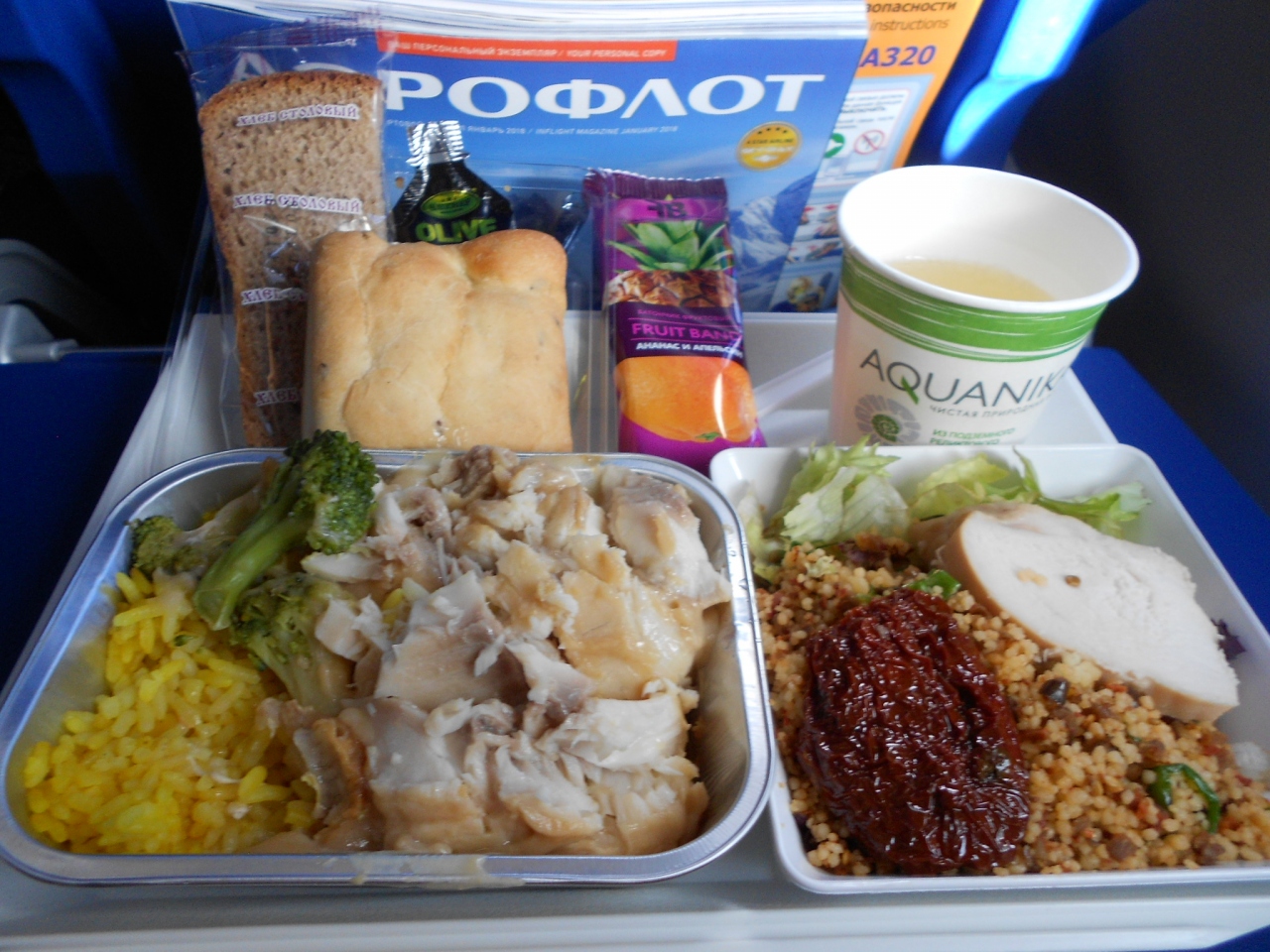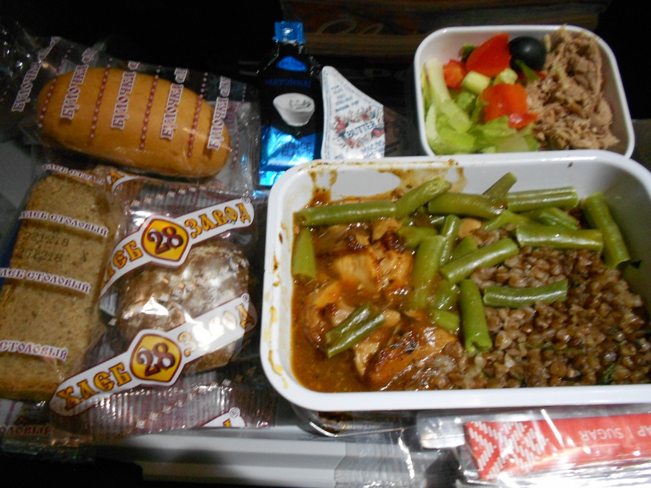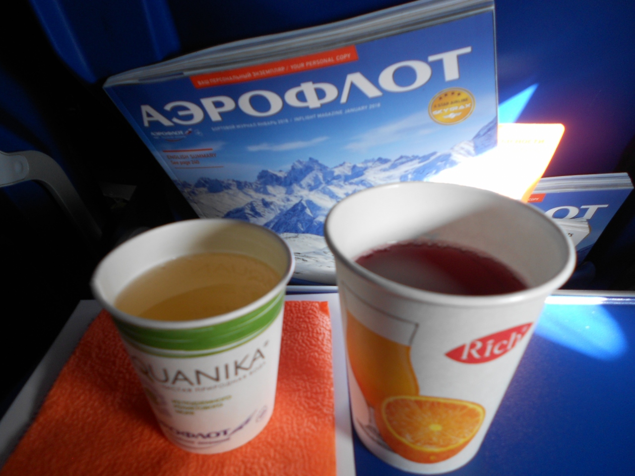 ローマ~モスクワは Airbus A330で3・3列、モスクワ~成田は Airbus A330で2・4・2列で、機材は新しくきれいでした。ローマを10分遅れで出発、モスクワには定刻より20分早く到着。所要3時間10分。食事が1回出ます。後方座席だったので食事は選べず。アルコールは出ないと聞いていましたがワインは出ました。食事を配る時には飲み物はくれないので食事前のドリンクサービス時にジュースとワインを頂きました。