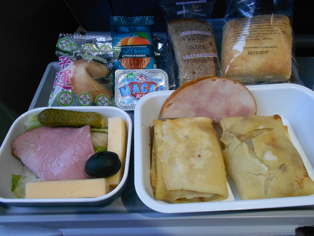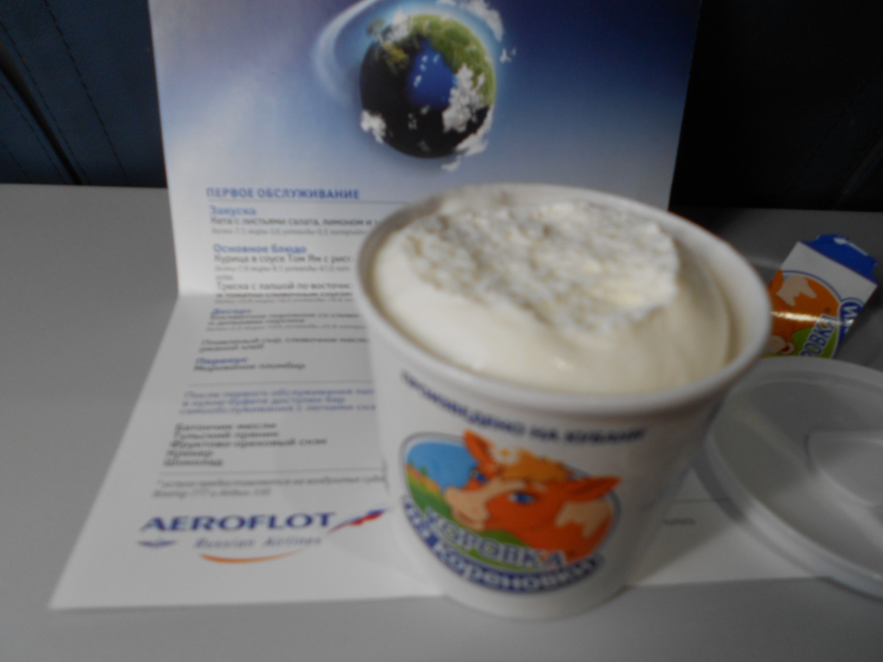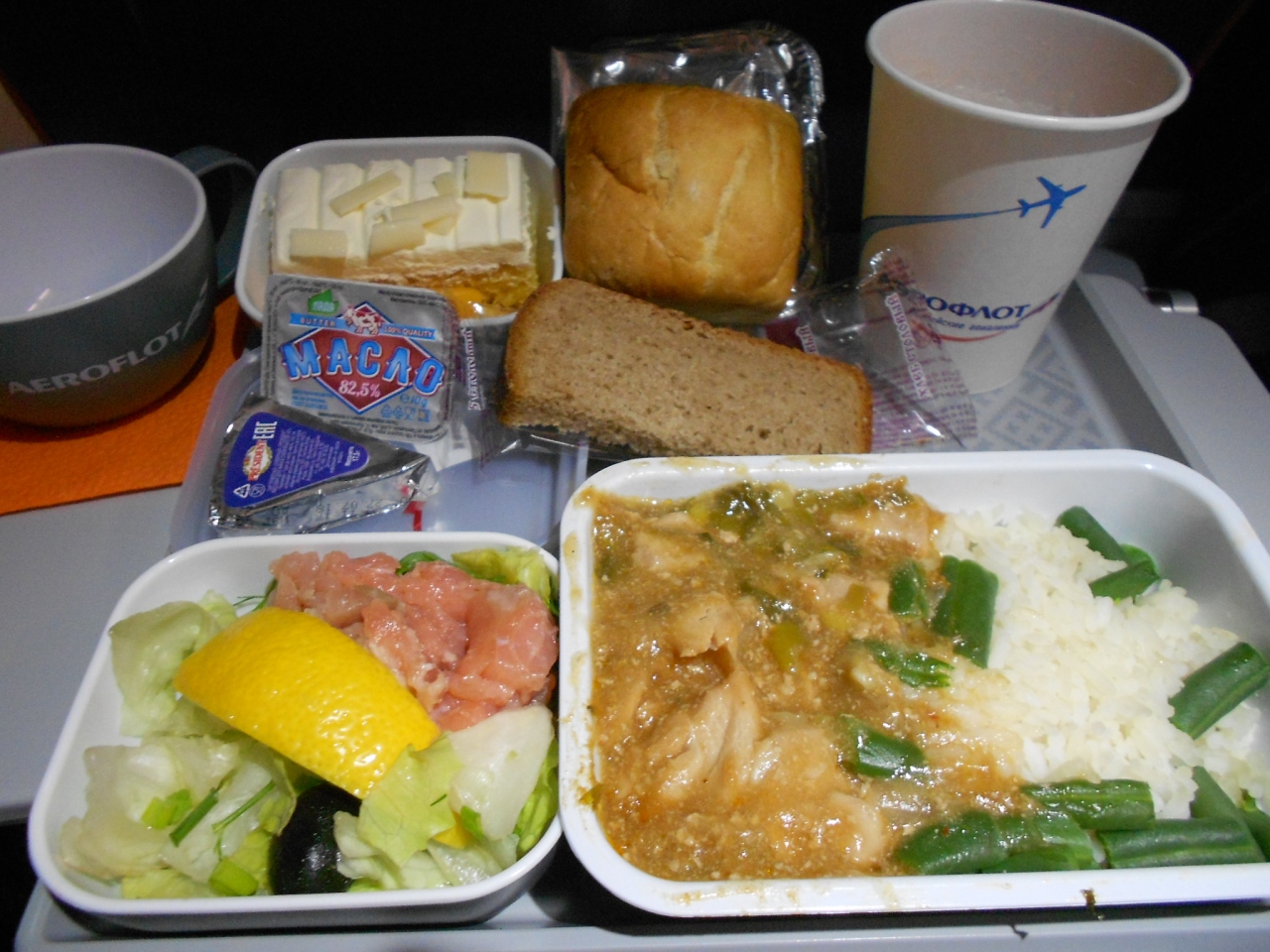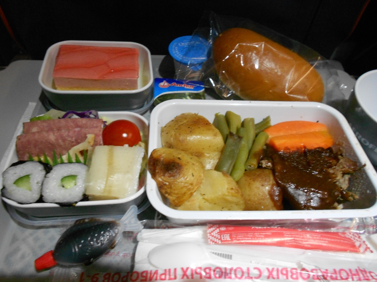 ローマ~モスクワは Airbus A330で3・3列、モスクワ~成田は Airbus A330で2・4・2列で、機材は新しくきれいでした。ローマを10分遅れで出発、モスクワには定刻より20分早く到着。所要3時間10分。食事が1回出ます。後方座席だったので食事は選べず。アルコールは出ないと聞いていましたがワインは出ました。食事を配る時には飲み物はくれないので食事前のドリンクサービス時にジュースとワインを頂きました。