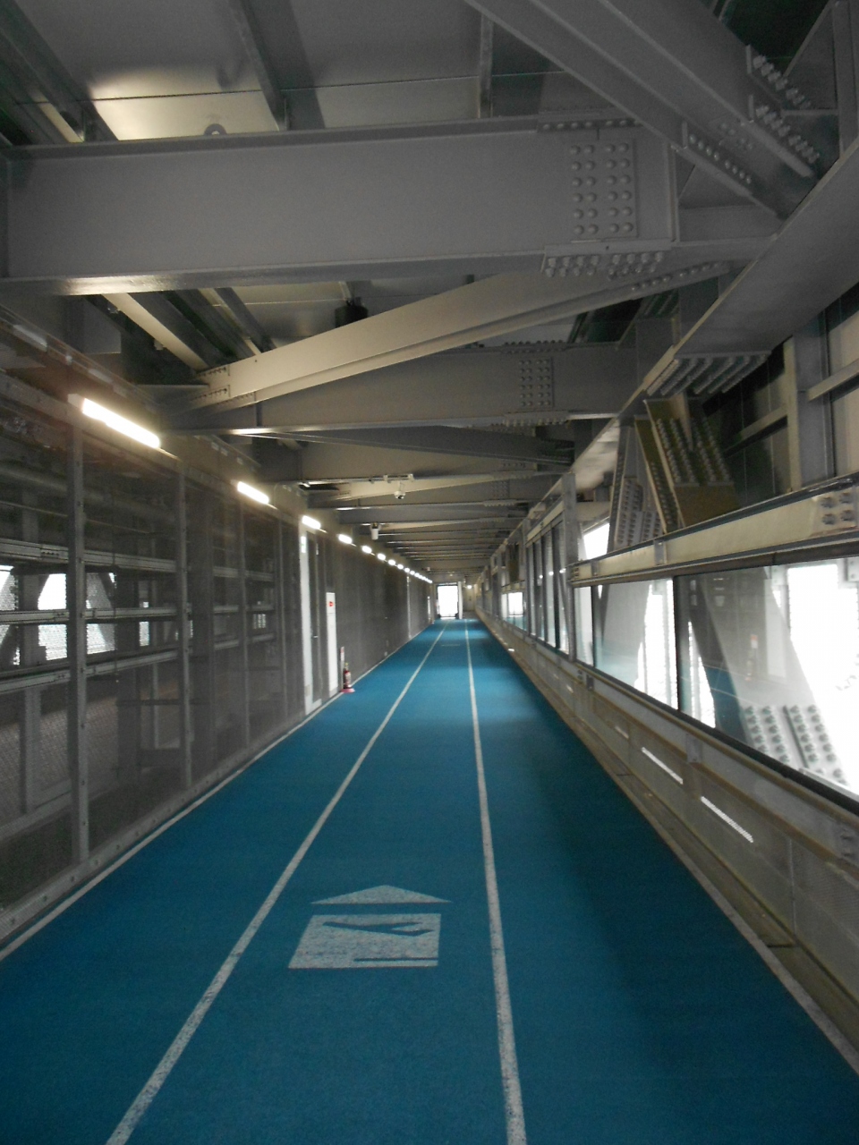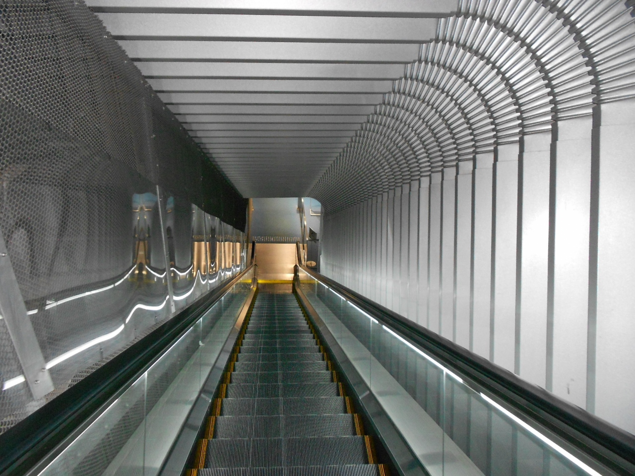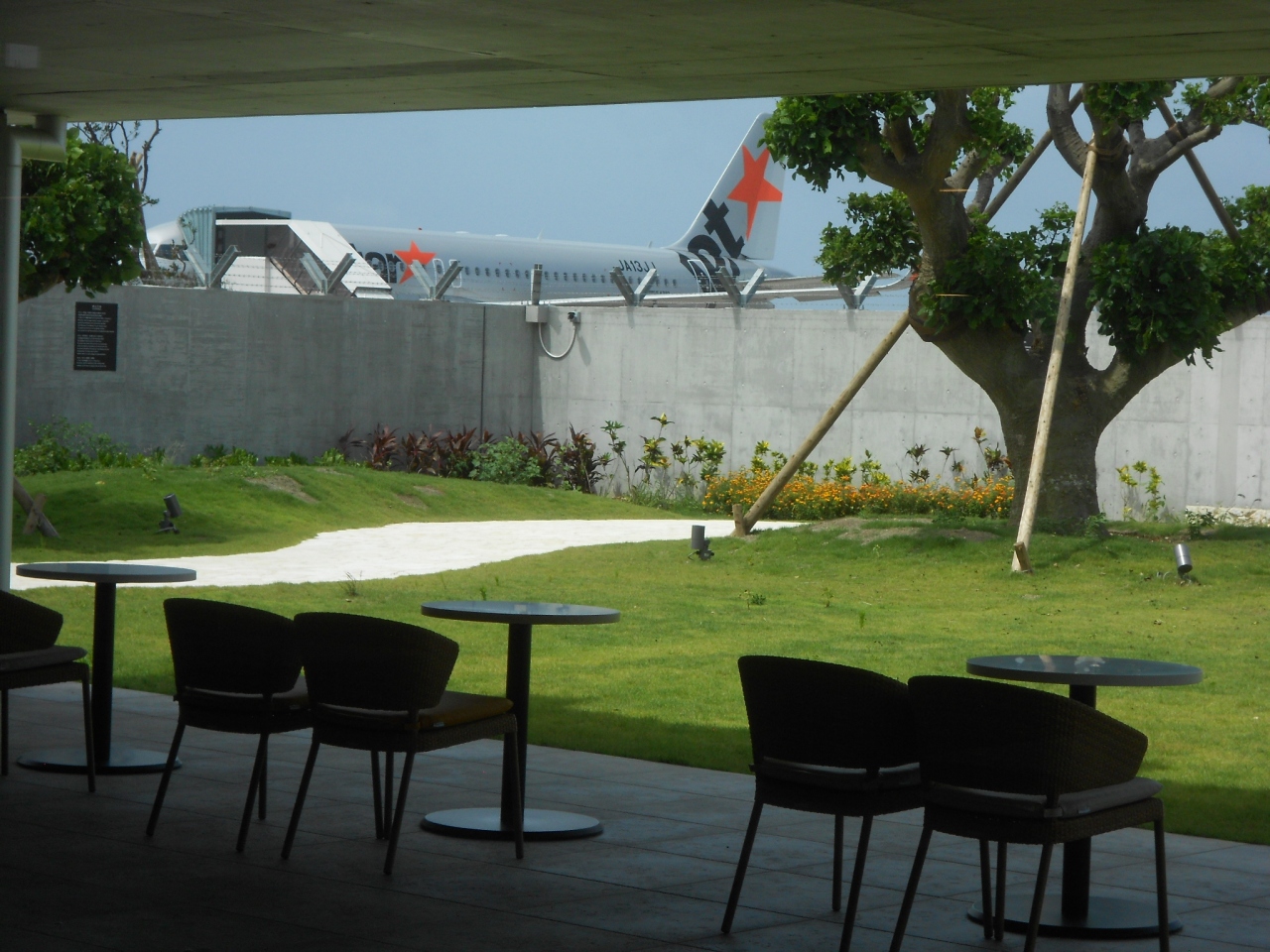 搭乗待合室へ向かう通路右手には滑走路が見えて、ジェットスターの機材がずらっと待機していました。シルバーの近未来的なエスカレーターを下ると搭乗待合室があり、間近に飛行機を見ることができました!特に真正面から飛行機の顔を見ることが出来てすごい迫力でした!