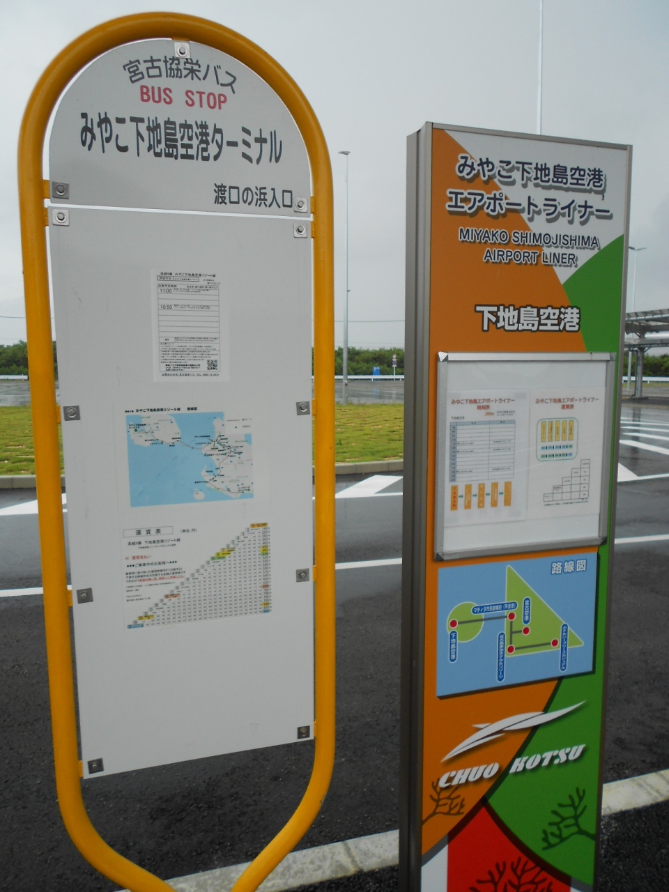 下地島空港から宮古島まで行きました。到着ロビーを出て左に行くとバス乗り場があります。路線バスの宮古協栄バスと、エアポートライナーの中央交通の2社が運行。