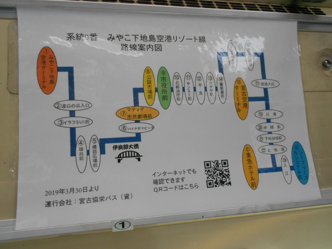 運行経路は、下地島空港~渡口の浜~伊良部大橋~パイナガマビーチ~マティダ市民劇場前~公設市場前~市役所前~サンエー前~宮古空港~下地役場前~東急ホテル~シーブリーズカジュアル。