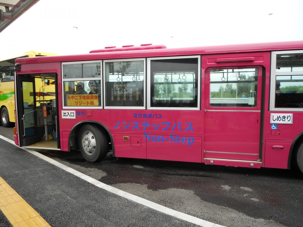 私はピンク色の宮古協栄バスで宮古島のマティダ市民劇場前まで行きました。片道490円。所要22分。11:00発の予定がなぜか時間変更になっており11:15出発に。乗車時に番号の入った紙を機械から取り、下車する時にその番号の料金を支払うシステムです。