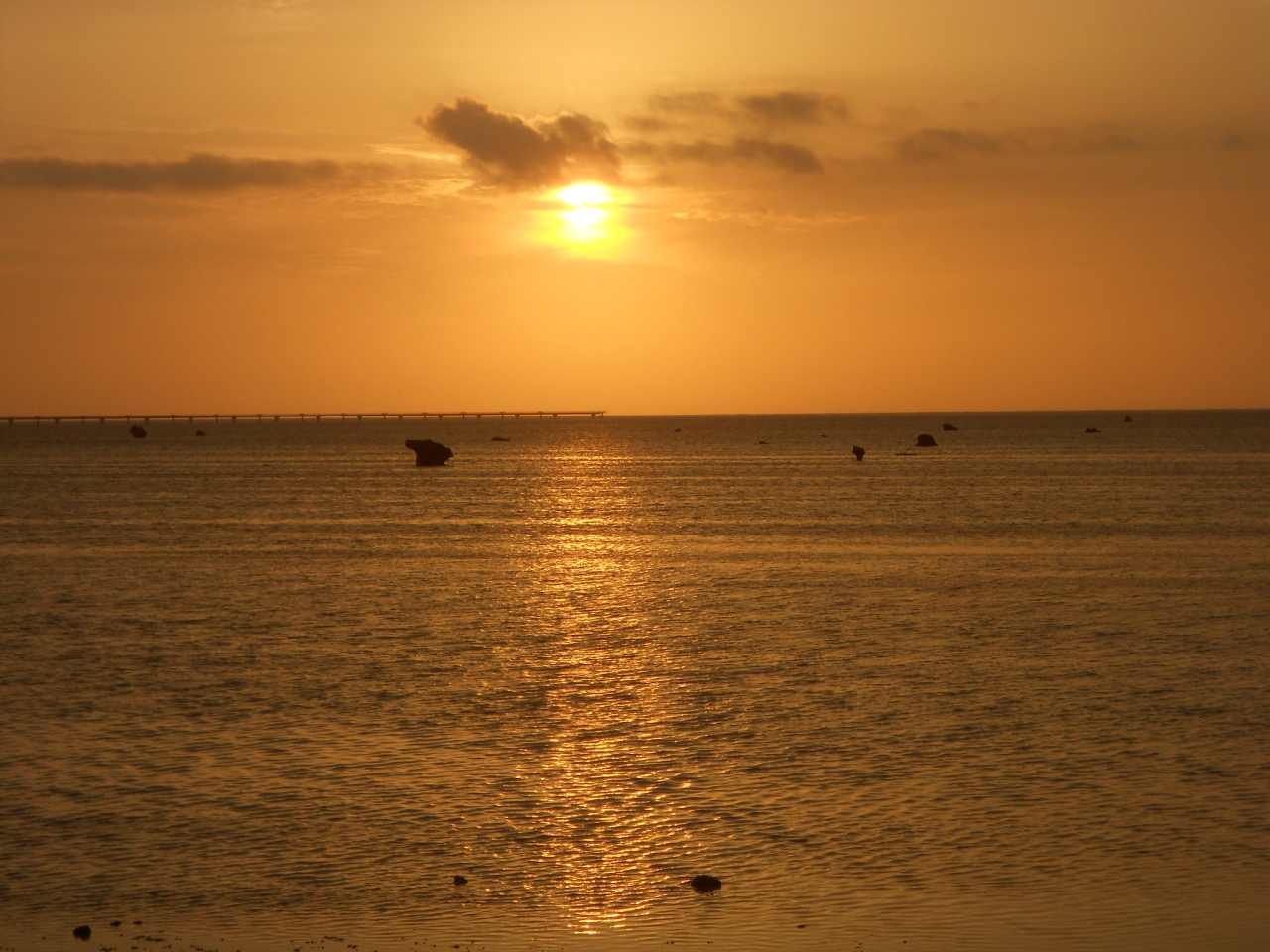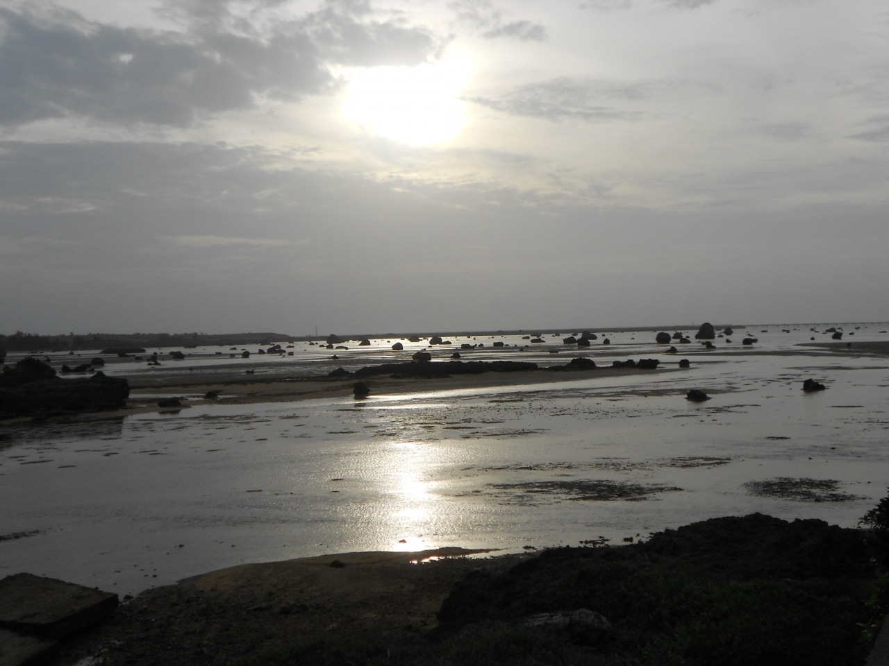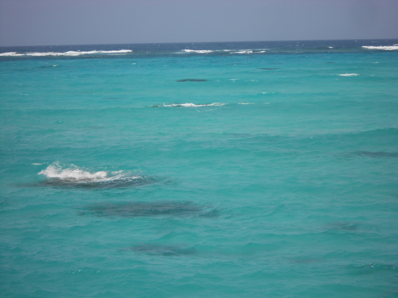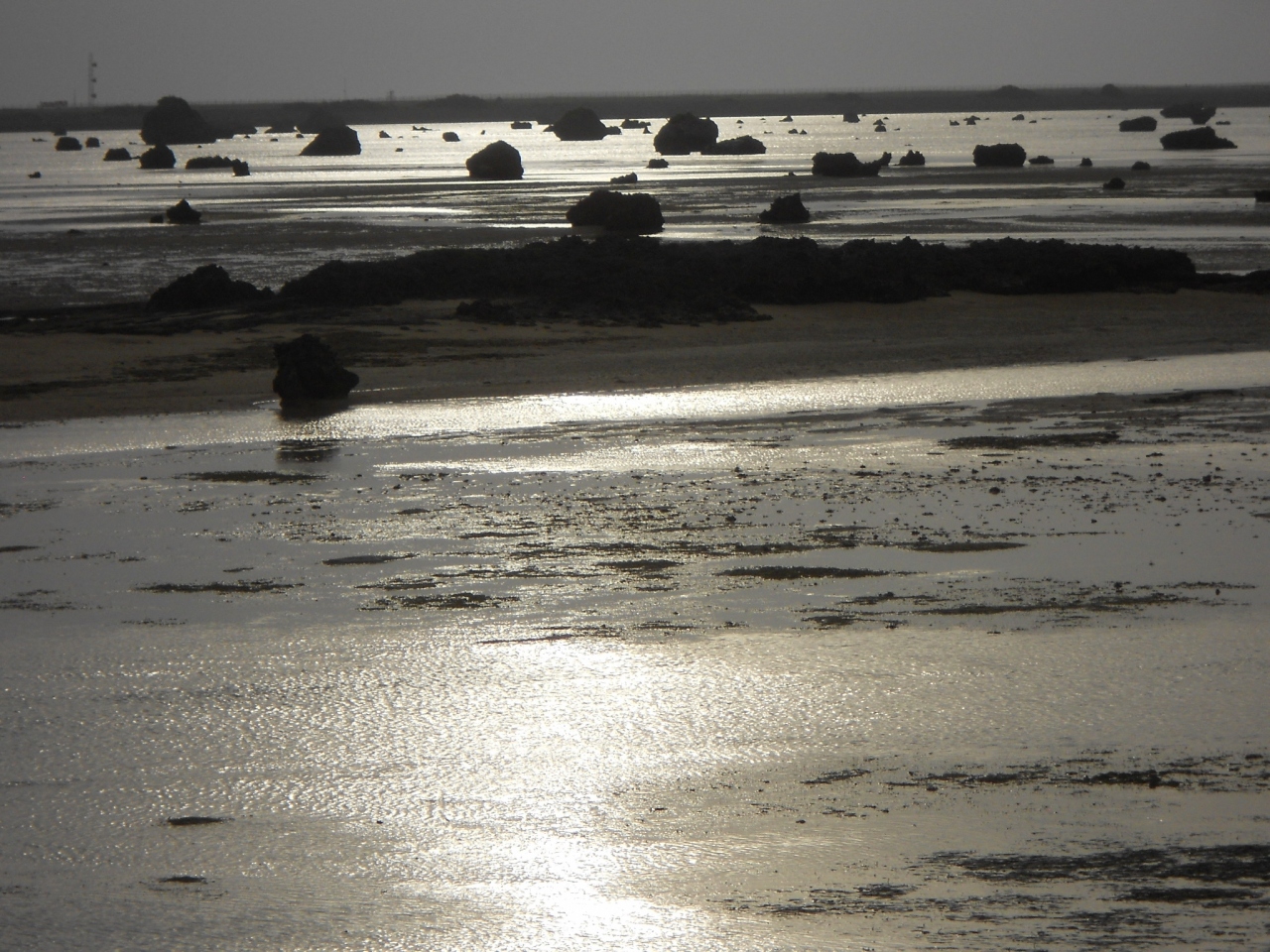 夕方になって少し波がおさまってきたので、シュノーケルを付けて海へ。手前のほうは珊瑚の状態が良くなく、中央の大きい岩の手前右付近はまあまあかな。