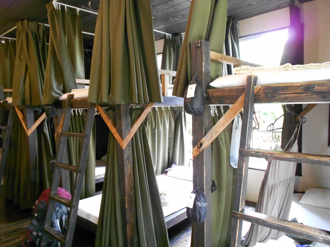 お部屋はミックスドミトリー。2段ベッドが4台、8人部屋。素泊まり1泊2500円。7泊すると1泊無料です!男女一緒なのでちょっとためらいがあったのですが、意外や意外、ほとんどが女子のひとり旅が多かったので平気でした。各ベッドにはライト・コンセント・カーテン有り。日中は扇風機のみですが、夜は冷房が入るので心地よく眠れました。(冷房代無料)