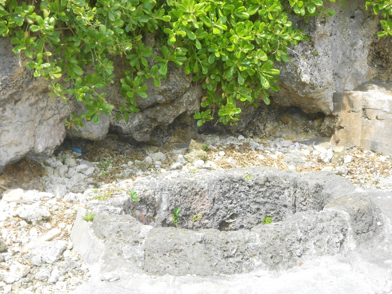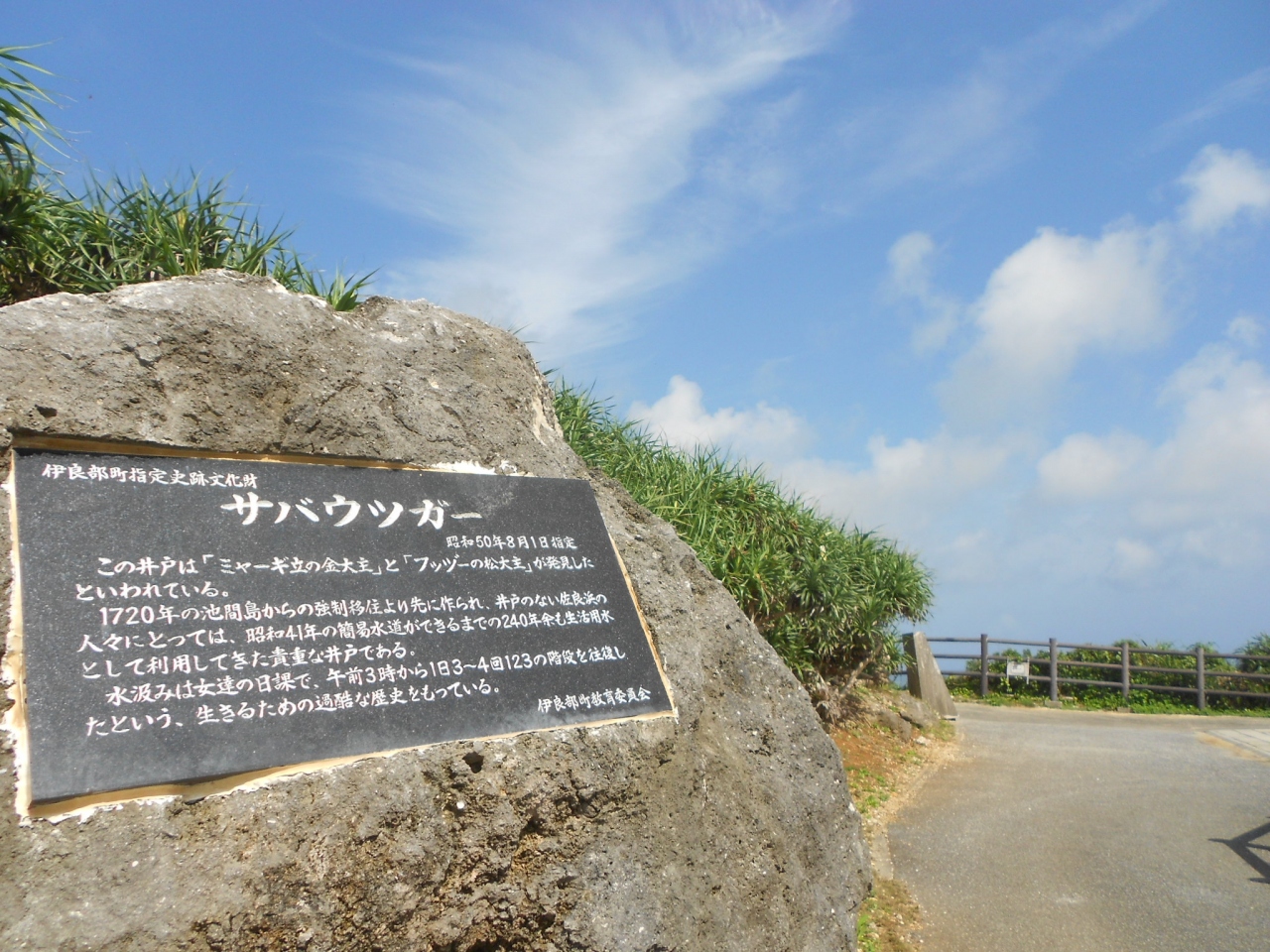 佐和田の浜近くの宿から共和バスで行きました。佐良浜港手前のJA佐良浜店前で下車し、徒歩10分程行くと公園があって、更に先へ進んだところに数台停められる駐車場があります。そこから下を見ると珊瑚礁の美しい海が見えました。急な階段を降りていくと、大きな岩がある海に着きます。左奥のほうに石の丸い井戸、サバ沖井戸がありました。今は水も無くただの穴でした。