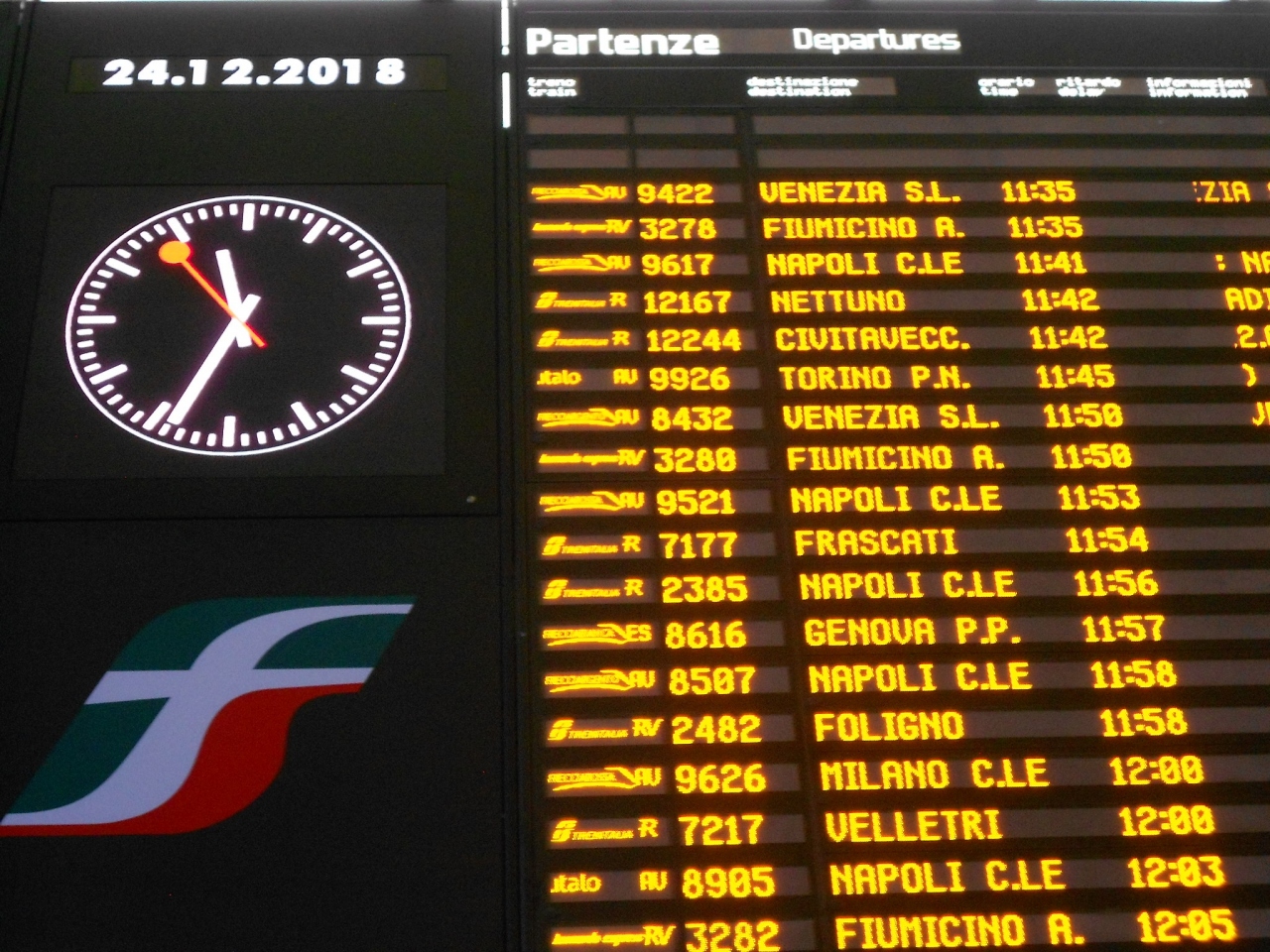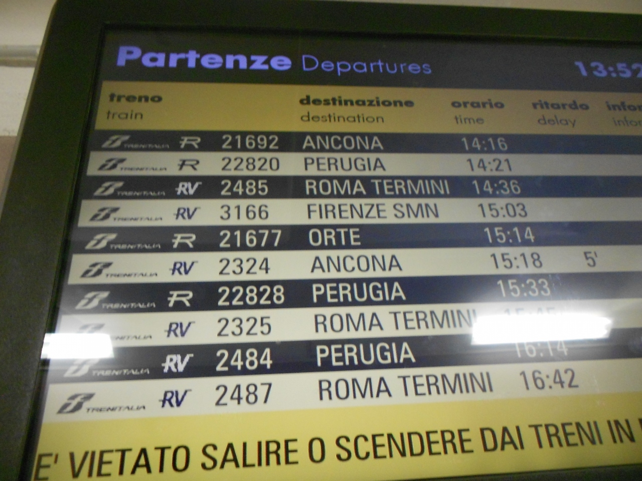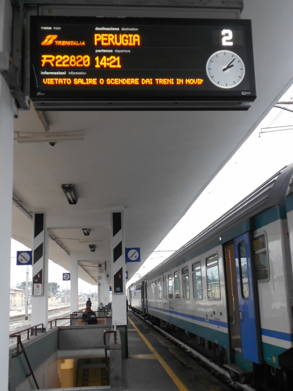 Foligno(フォリーニョ)で乗換え。Binario (ホーム)2に着いて列車を降り、電光掲示板で次の列車情報を確認します。すると、Perugia(ペルージャ)行きの同じ列車、同じホームでした。そのまま降りなくて良かったようです。