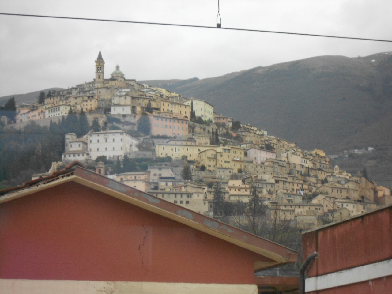 列車はほぼ定刻に発車。途中右側丘の上に絵本のようなTreviの町が間近に見えました。