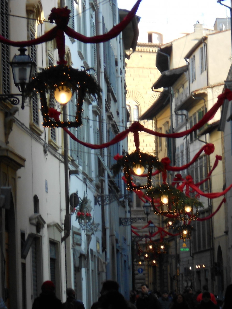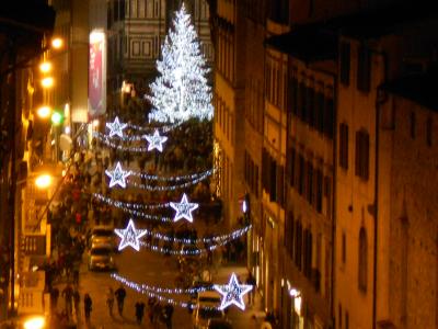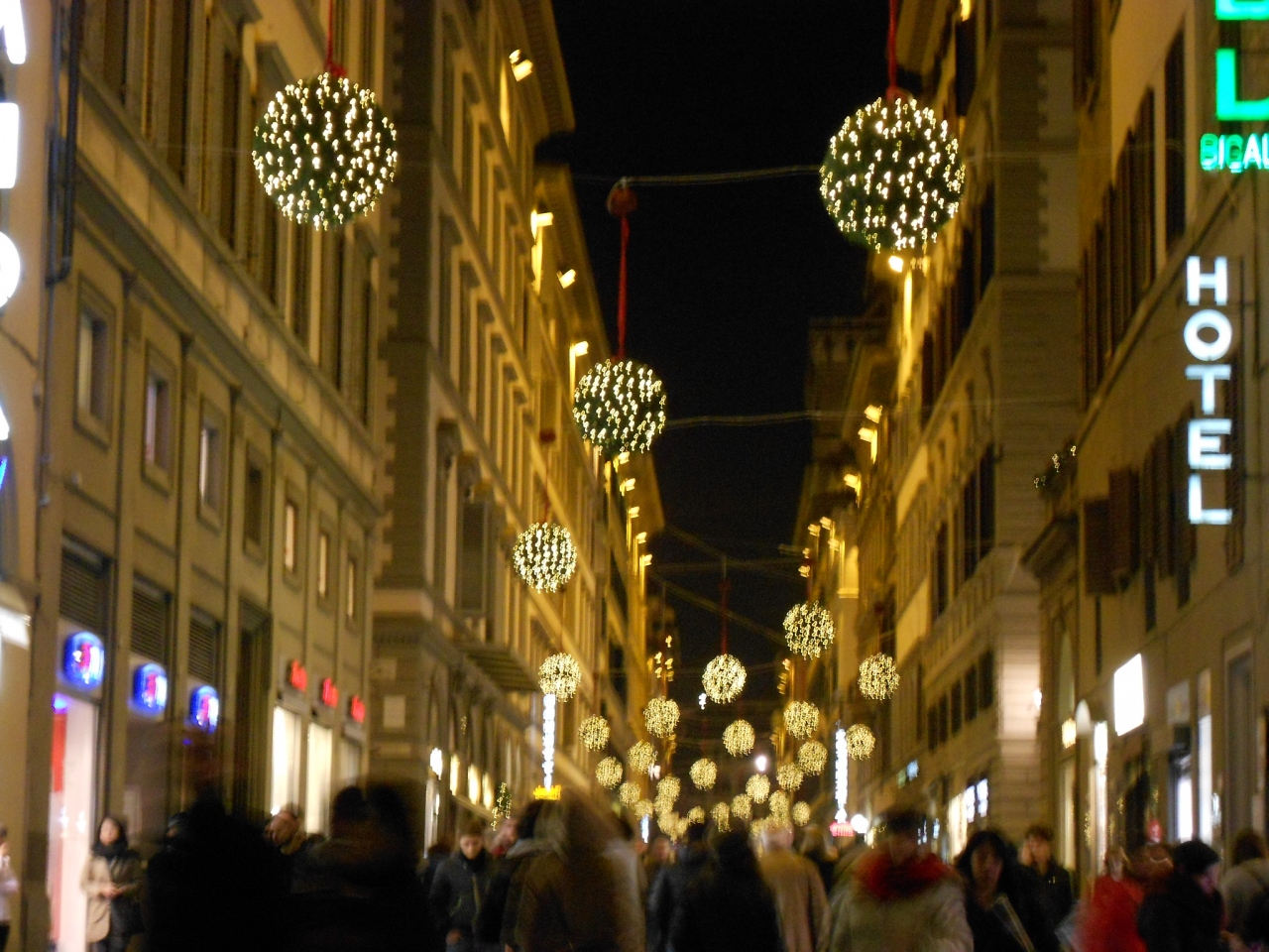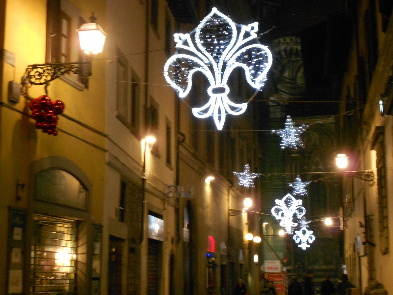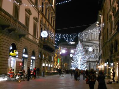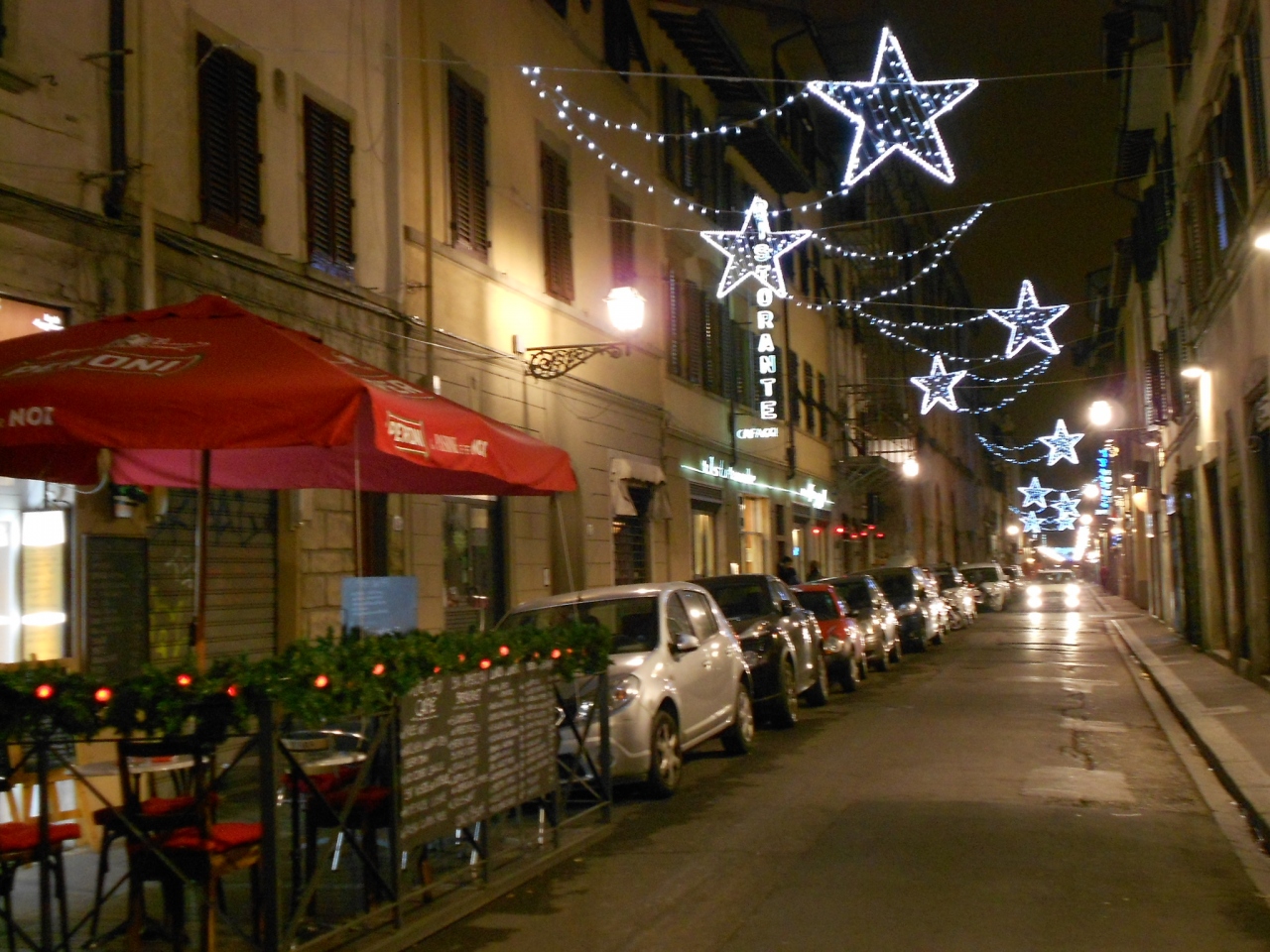 クリスマス時期のフィレンツェは、夜になると至る所にイルミネーションが飾られ、夜のお散歩がとても楽しみです。メインストリートはもちろんのこと、小さな裏通りもかわいらしいシックなイルミネーションで飾られていました。昼とはまた違った、夜の美しい中世の街並みに感激しました。