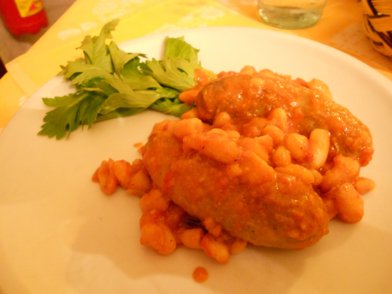赤ワイン(デキャンタ)。パン。プリモとセコンドと付け合わせは数種類の中からチョイスで、私はラビオリ、友達はトルテリーニ。それとサルシッチャに豆をチョイス。