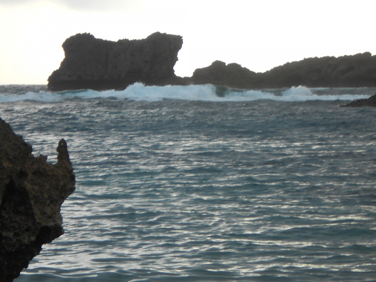 5月末の昼頃、梅雨に入っていましたがとても暑くいい天気。ビーチ中央にある大きな岩に砕ける白い波しぶきにビックリ!人は結構いましたがうねりが凄くて海の中に入っている人は少しだけ。