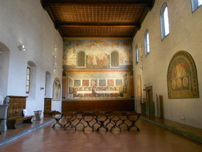 内部にはルネッサンス初めの遠近法で描かれた「最後の晩餐」Ultima Cena(1447年)や、3つの「キリストの受難」の場面などのフレスコ画が残されています。