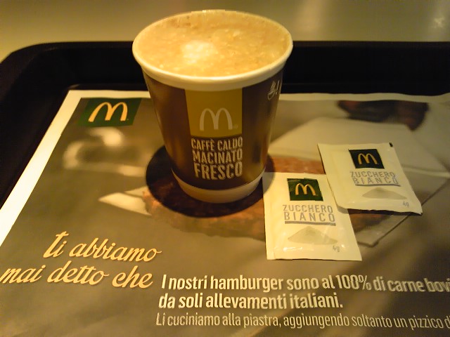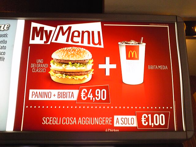 ビッグマックはパニーノと書いてありました。ドリンク中とセットで4.90ユーロ。簡単なランチにいいかも~。イタリアのマクドナルドにはイタリアオリジナルメニューや生ビールもありました。トイレも貸してもらいました。- 旅行時期
