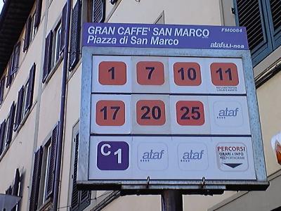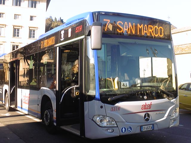 フィエーゾレ行きのバスはサンマルコ広場から出る。7番のバスがフィエーゾレ行き。1月1日は本数も少なく1時間に2、3本。バスの切符はバス停にある自動販売機で購入。90分有効で1.20ユーロ!安い!ほどなくバスが来ました。お!ベンツのバスです!乗車したら車内にある刻印機で乗車券に刻印をすることをお忘れなく。この刻印が無いと罰金を取られます。