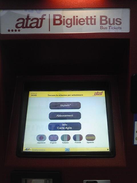 イタリアではバスの切符は Tabakki タバッキで買えるのですが、サンマルコ広場のバス停に切符の自動販売機があったので買ってみました。するとなんと5か国語対応でなんと日本語も入っているではありませんか!ビックリ!しかもタッチパネル式です。