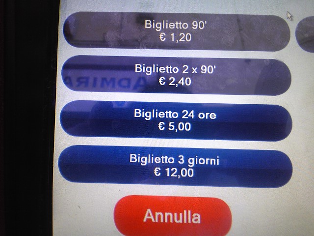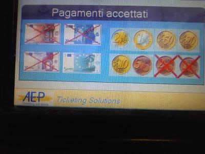 次に支払いの画面。クレジットカードや大きな紙幣と少額コインは使えないようです。可能なのは、5ユーロ紙幣、コインは2ユーロ・1ユーロ・50・20・10・5チェンティージミ。小銭を用意しておきましょう。