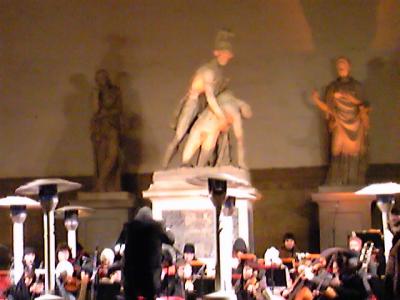 その一角にいくつもの彫刻が並ぶランツィのロッジアがあります。そこがカウントダウンの舞台。。。なんとオーケストラの生演奏です。