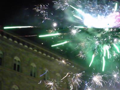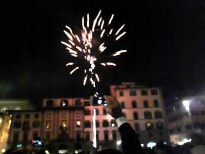 ヴェッキオ宮の塔の時計が12時を指す。ステージではクラシック音楽の演奏が続く中イタリア人たちがみんな一斉に大声でカウントダウン!歓声が上がり、抱き合ってキスするイタリア人たち!みんな大騒ぎ~!激しい爆竹の音!白煙筒の煙!過激~!!そして新年を祝う花火~!!歴史ある建物をバックにあがる花火はそれはそれは素敵でした~!- 旅行時期