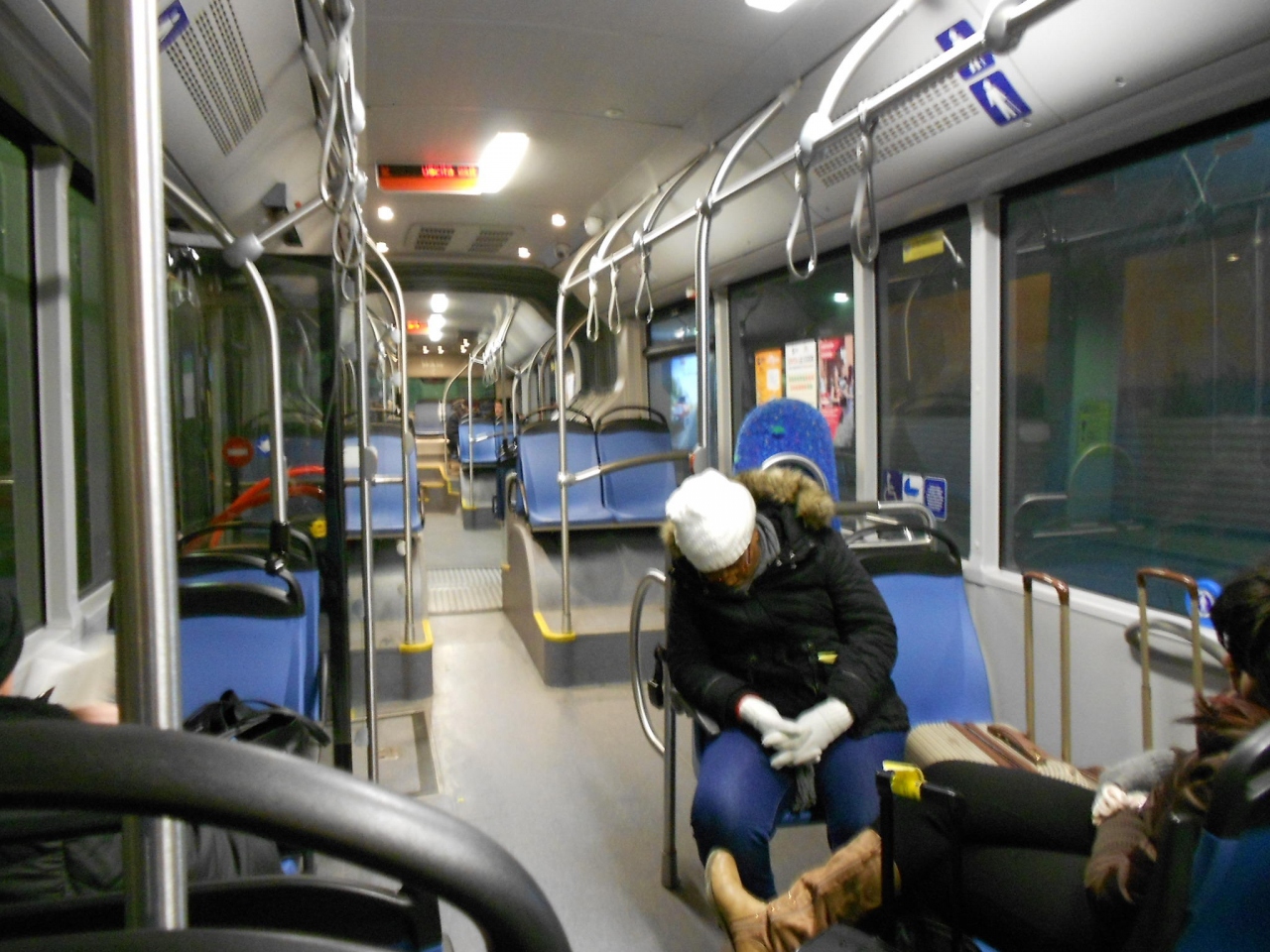 バスに乗ると機械があり、何も書かれていない切符をかざすと「ピッ!」と鳴った。おお~ハイテク~!普通は切符の刻印機に切符を差し込むと日付けと時刻が切符に刻印されるのですが、この切符には何も刻印されませんでした。不思議~!スーツケースは自分で車内に持ち込み、荷物置き場に置けました。