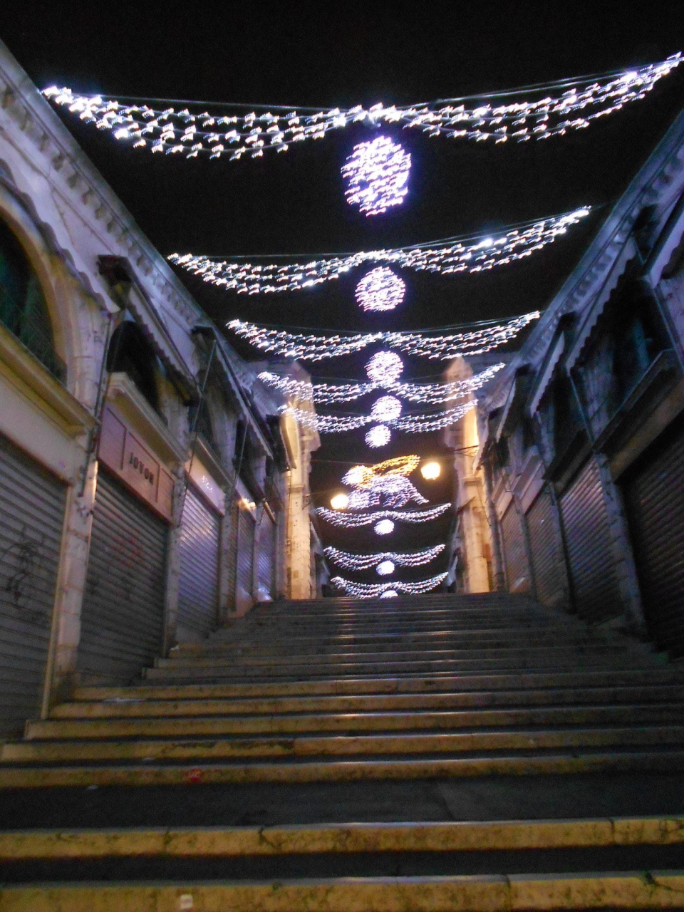 イルミネーションを眺めながら夜の街を歩くのもいいかなと、サンタルチア駅からスーツケースを転がして歩いて行ったのですが、40分かかりました。ずっと石畳なので結構大変でした。おまけに橋が8つもあってすべて階段!きっつい~!地図を見ながら行ったのですが、よくわからない細い道になったり、二又に道が分かれていたりで、人に聞きながらやっとのことでリアルト橋にたどり着きました。大きな重いスーツケースの方はヴァポレットを利用したほうがいいでしょう(笑)。