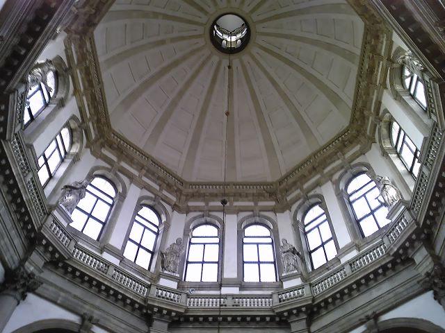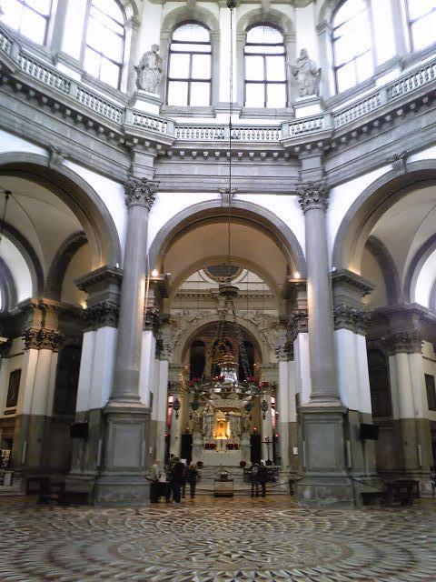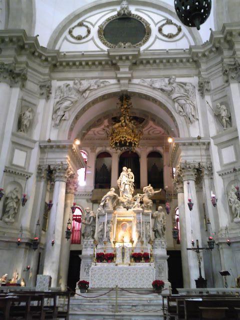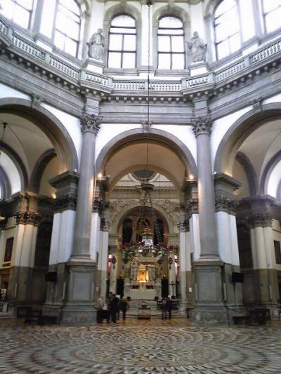 ヴェネツィアン・バロックの傑作とも言われる大聖堂サンタ・マリア・デッラ・サルーテ教会Santa Maria della Salute。丸い大きなクーポラと八角形を描く真っ白な大理石。その優雅なたたずまいはヴェネツィアの象徴です。丸天井のクーポラから光が降り注ぐ明るい堂内。主祭壇にはキャンドルが灯され真っ赤なポインセチアが美しかった。