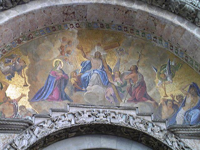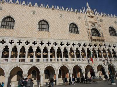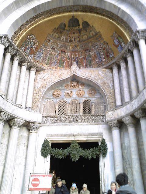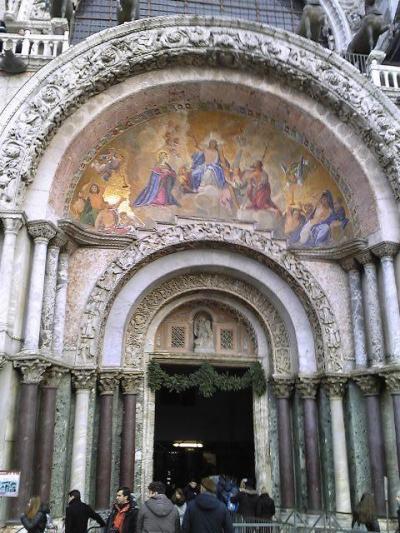 ヴェネツィアのシンボル、サン・マルコ寺院 Basilica di San Marco 。ロマネスク・ビザンチン建築の傑作で9世紀に建てられ、正面は大理石によるいくつもの柱が連なり2層のアーチが横に5つ並んでいる。どのアーチも金色のモザイクとゴシック様式の繊細な装飾で飾られている。正面の5つのモザイク画は、聖人マルコの遺体を運び出す一連の伝説を描いたもの。まるで絵画のようで本当に素晴らしい!