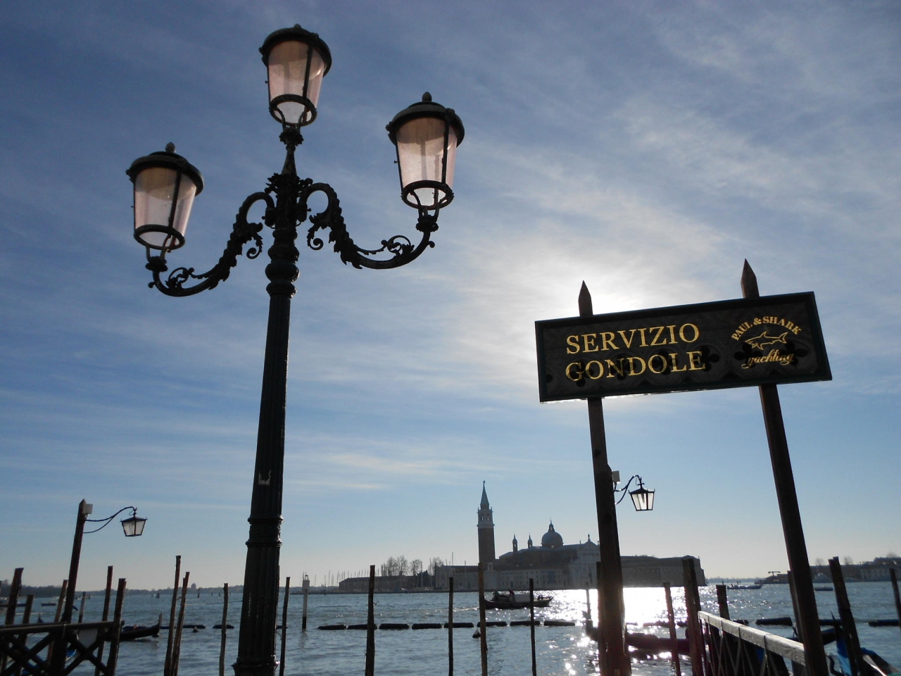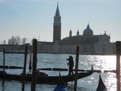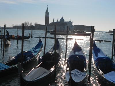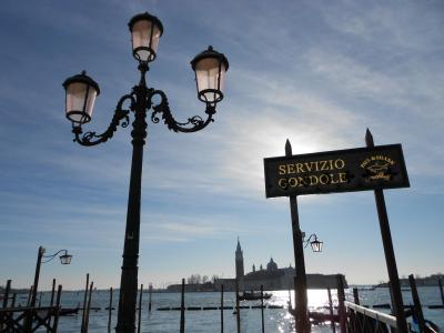 時折り行き交うヴァポレット。アドリア海に浮かぶゴンドラ。逆光に映し出されたゴンドリエーレのシルエットはまるで映画のワンシーンのよう。太陽の光が海面にキラキラ。。。アンティークな街灯が青空に映えています。