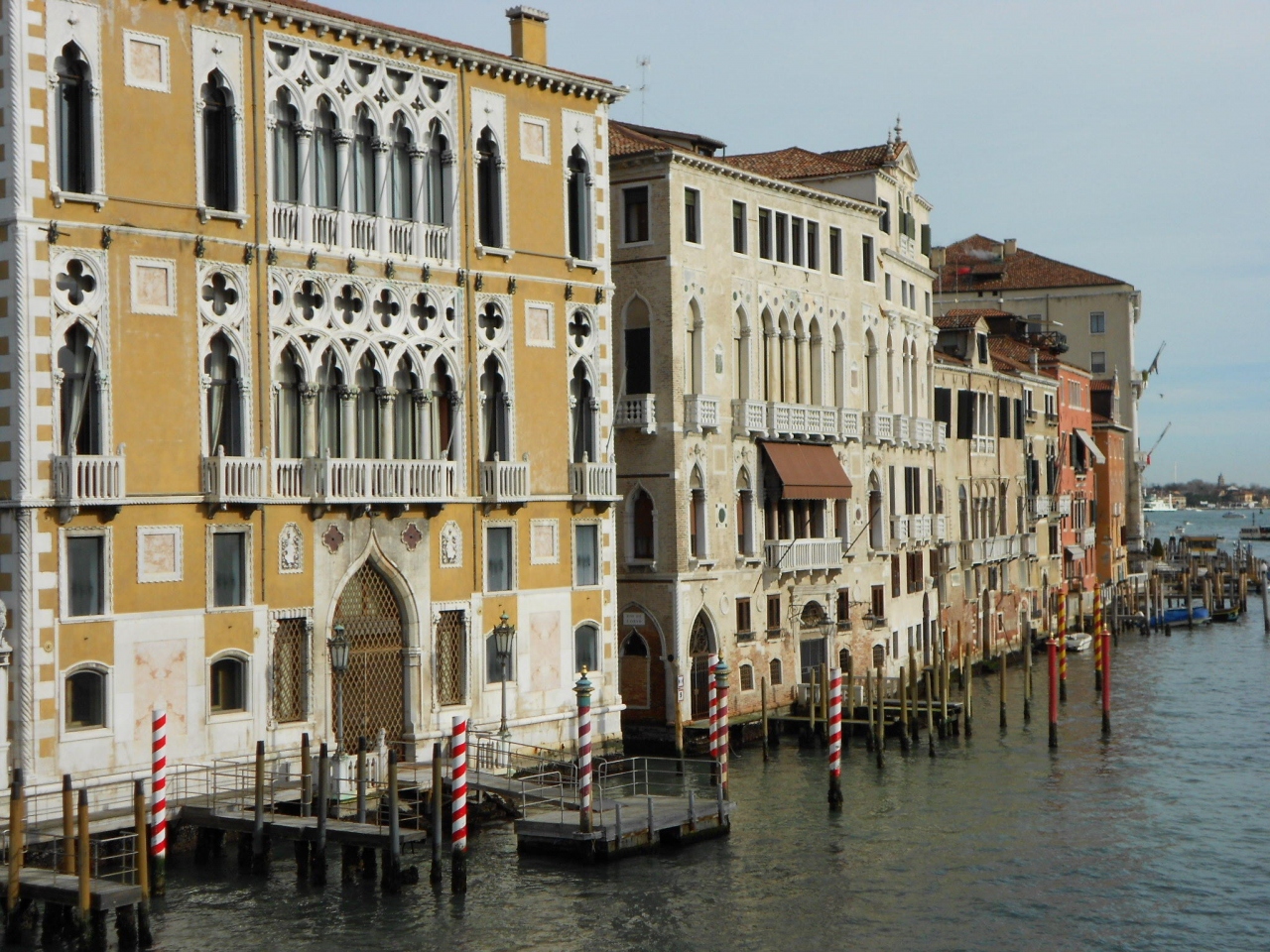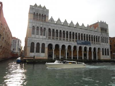 サンタ・マリア・デッラ・サルーテ教会、木製の橋アカデミア橋、白大理石が美しいリアルト橋は太陽の光でキラキラ。メルカート魚市場、バロック様式の館、カ・ペーザロの飾り柱を多用した優雅な姿は運河にひときわ映えて美しい~!