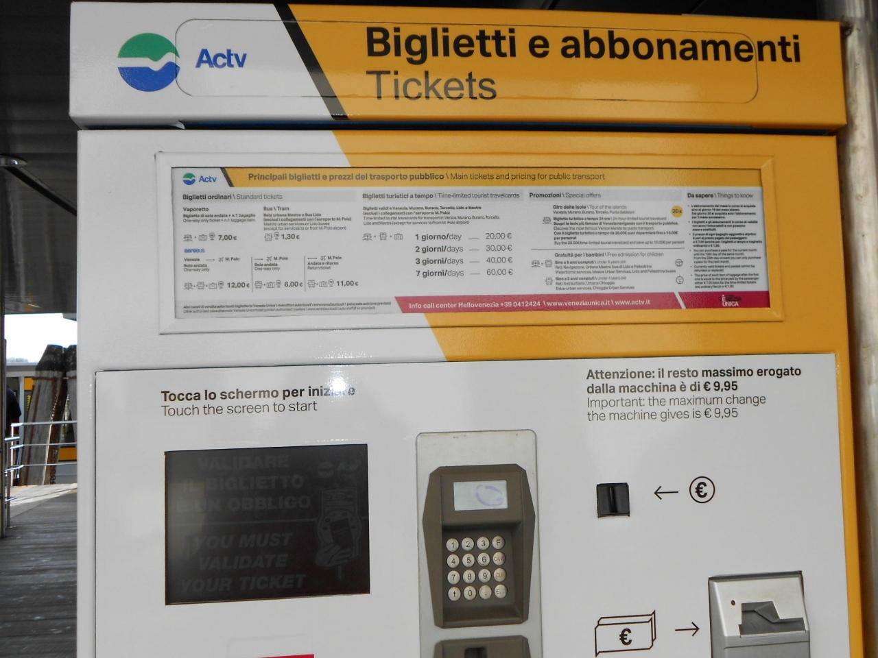 切符の自動販売機はイタリアでは壊れている場合もあるので、窓口が開いている時は窓口で買うほうが安心です。ヴァポレットの切符には何も書かれていなくて不思議~。電子式らしく切符自体はみな同じだが情報がデータで入っているらしい。
