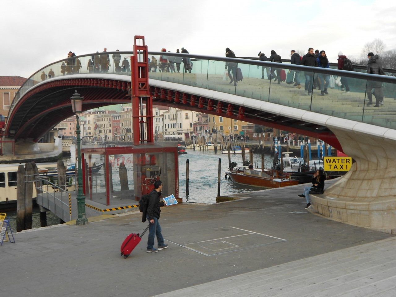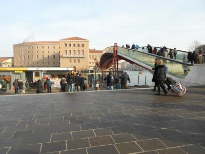 マルコポーロ空港からのバス発着場 Piazzale Roma から、サンタルチア駅へ行こうとしたら、大きなアーチ型の橋 Ponte Costituzione を渡らなければなりませんでした。段差は緩やかなのですがキャスター付きスーツケースを引きずりながら渡るのはかなり大変でした。せめてスロープがあったらいいのにと思います。