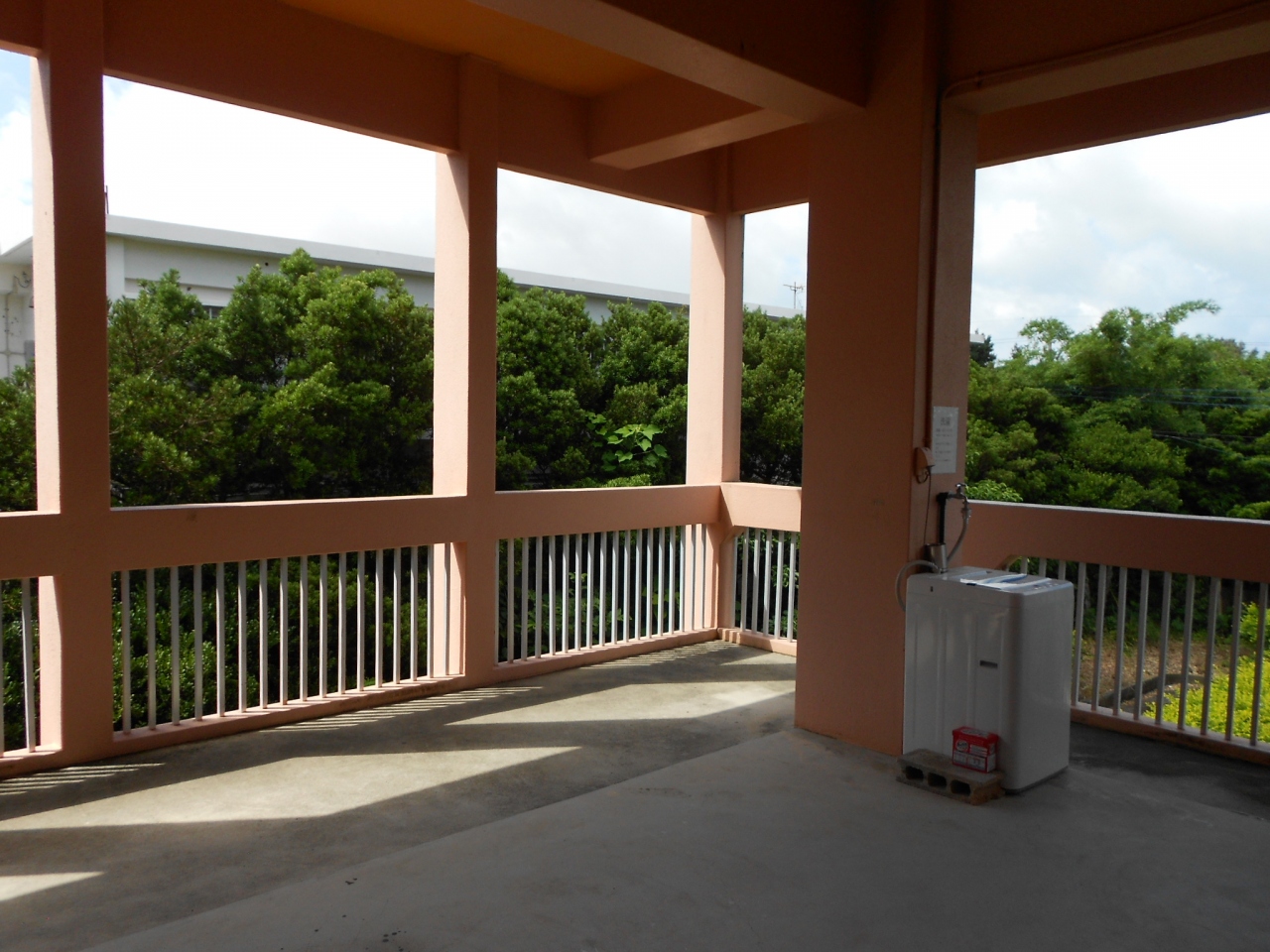 2階は個室と共用バストイレ・共用冷蔵庫。広いベランダがあって洗濯物干し・洗濯機(有料)有り。