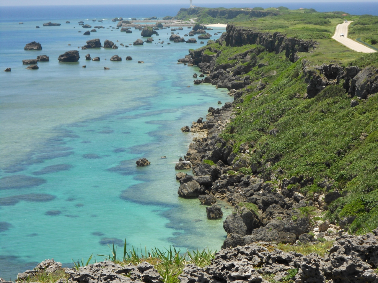 その道は急な登り坂で、少し走ると、右側にちょっとした露店のようなものがあって車を降りて行ってみると、東平安名崎への道と岩がごろごろしている宮古ブルーの海!あのポスターのような美し風景が広がっていました!綺麗~!眼下には珊瑚礁も!