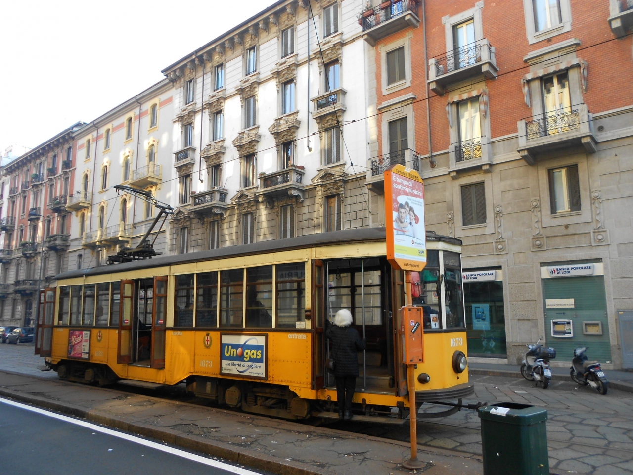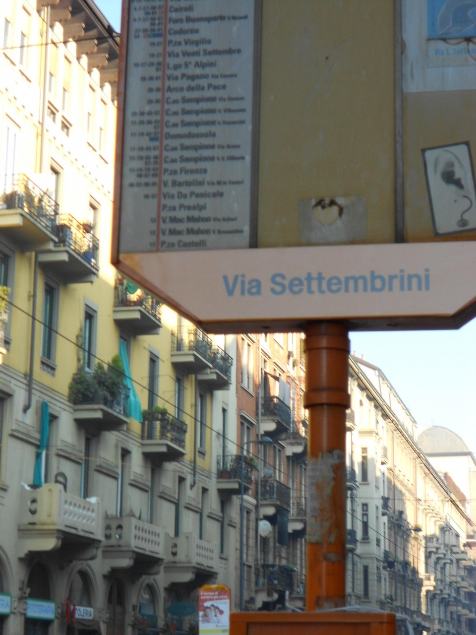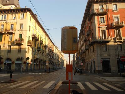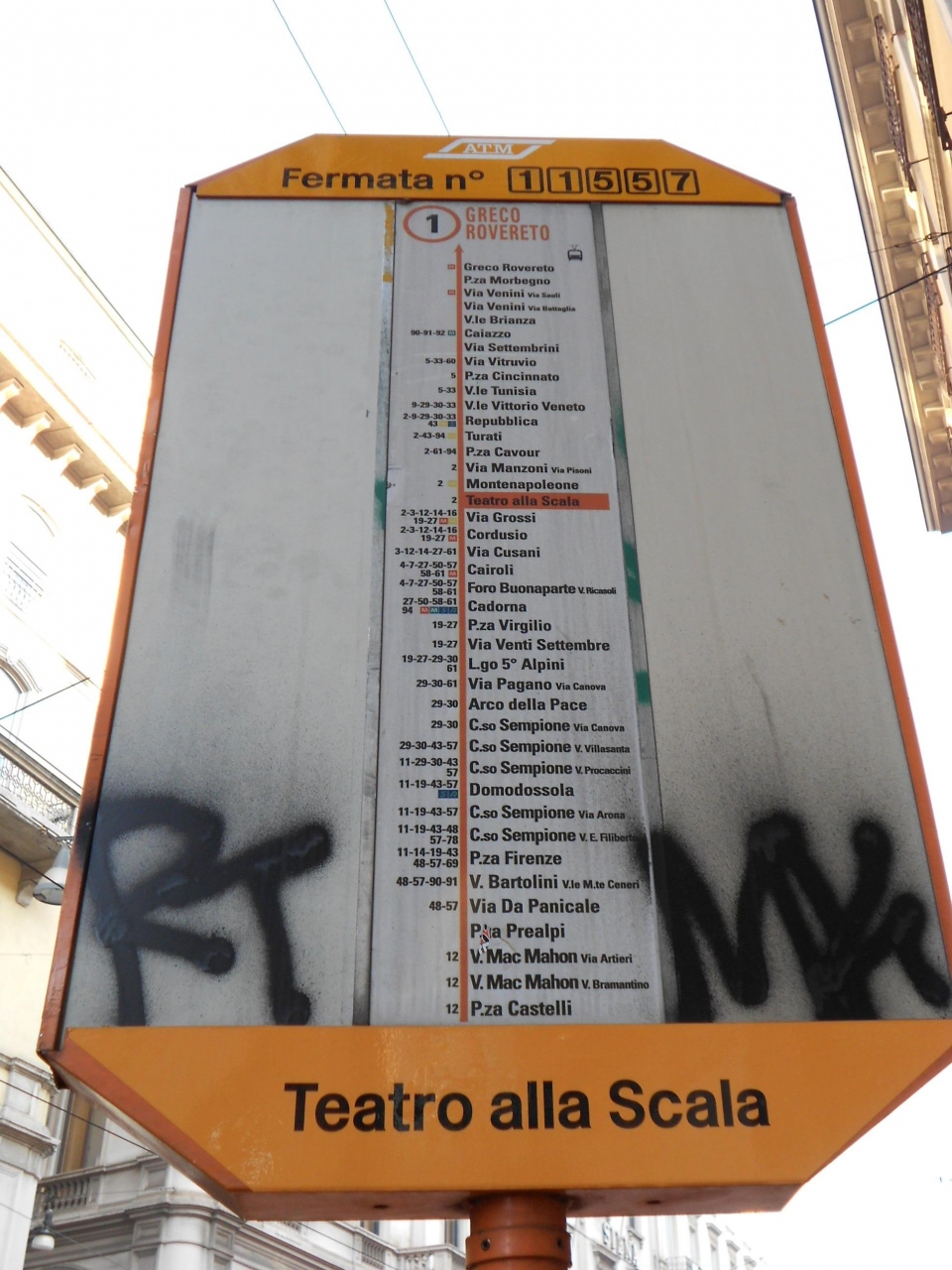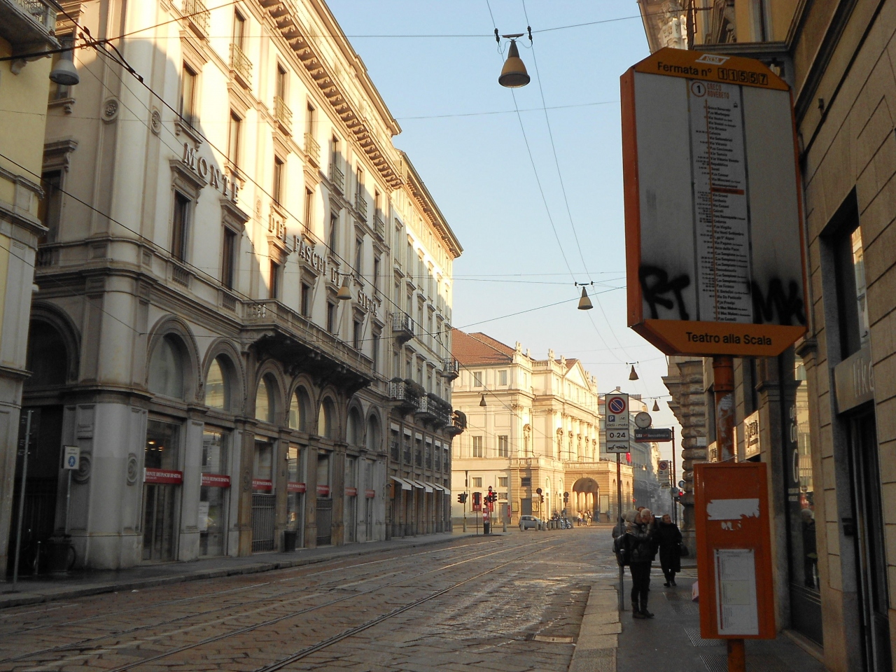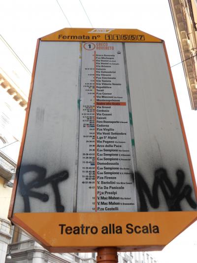 左の建物 Farmacia ファルマチア(薬局)前の停留所がTeatro alla Scara へ行く時の乗り場。