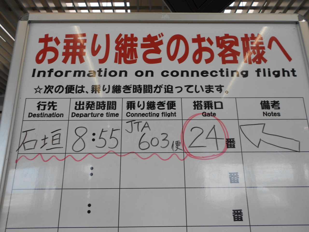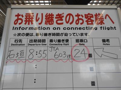 那覇空港に到着。ほぼ満席だったので後方の席から到着ロビーに出るまで約10分かかりました。ロビーに出ると乗換案内版が出ていて、石垣便の搭乗ゲートは目と鼻の先のとても近い場所でした。