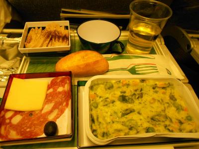 最初の機内食はイタリアンと和食が選べます。私はもちろんイタリアン!メニューは、ほうれんそうとベジタブルのラザニア風・サラミ・チーズ・黒オリーブ・バン・チョコレートケーキ・白ワイン・コーヒー。美味しかった~!