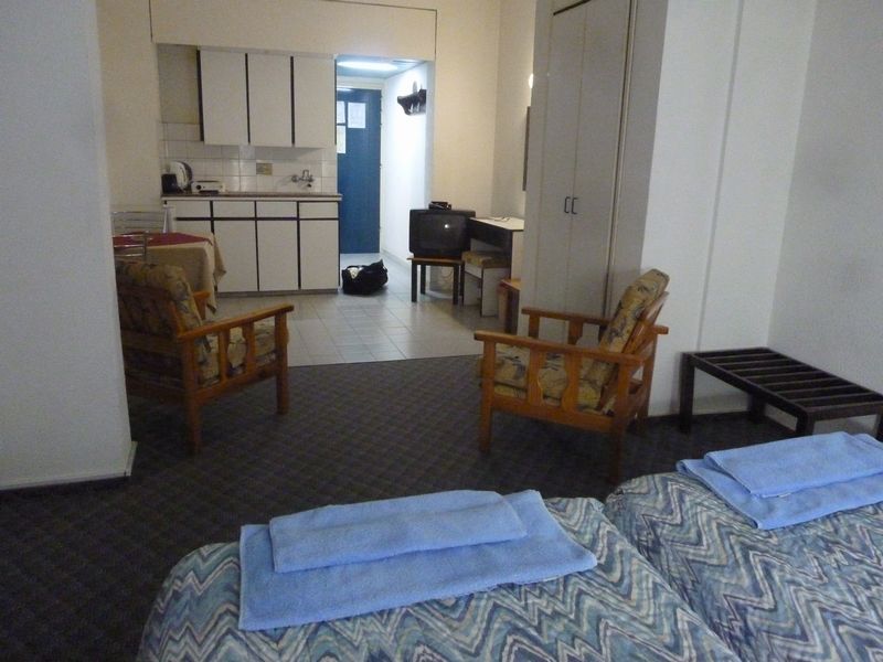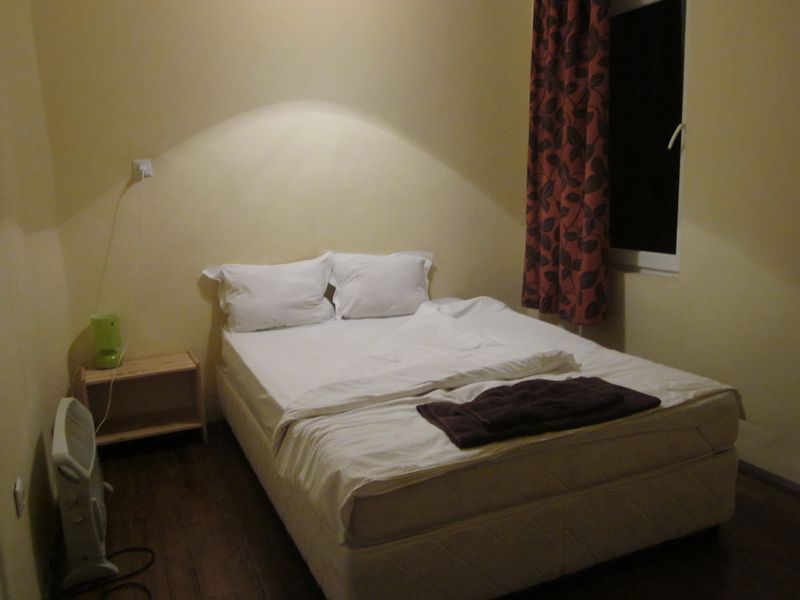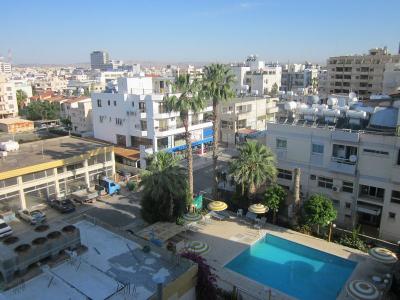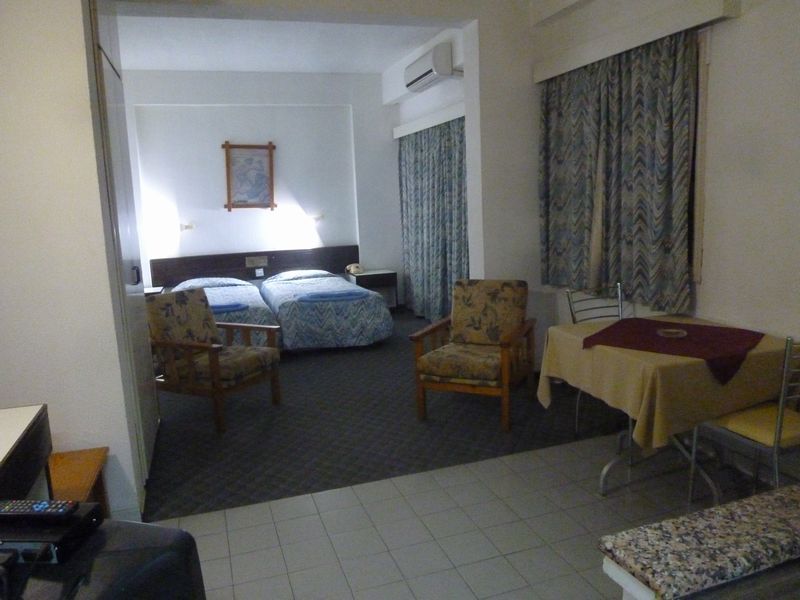 Booking.comで予約しました。ラルナカ市内中心部からは、国道沿いを歩いて15分くらいかかるので、目抜き通りという訳ではありませんが、ツイン1泊26ユーロでリーズナブル。アパートメントをホテルに改装していて、建物自体は古いですが、部屋にはキッチンもあり、かなり広いです。プールもあるし、近くにはタベルナ(レストラン)やコンビニ、向かいにはネットカフェもあり、旅に必要なものはそろっています。