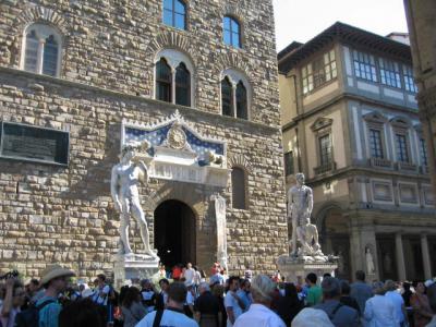 コの字型の一番奥にはバールがあり、ちょうどランツィの回廊の上がテラスになっているのでドゥオーモとその後ろにあるフィレンツェの丘の写真撮影もできる。ここが唯一写真撮影のできる場所。