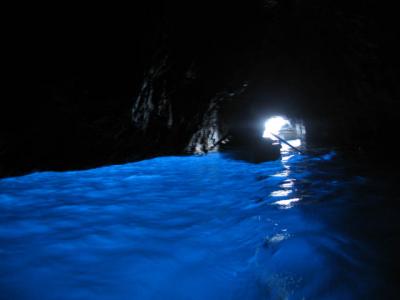 青の洞窟へは中型の船で移動し、洞窟の前で小型の舟に乗り換えます。通常4人乗りボートですが、船頭さんを入れて5人乗ってぎゅうぎゅうでした・・・。入口は狭く頭があたりそうなので寝そべったままで待機・・・中に入れたら起き上がれます。写真を撮るので必死になりますが、実際、目で見て下さい!!デジカメからみていた風景よりも何十倍も綺麗なブルーでした。まるでブルーのバスクリンを入れたみたいで・・・思わず手にすくってみましたが本物の透明でした(笑)これは光の加減でこういう色に見えるそうです。真っ暗だと真っ黒です。。。光の加減によってはもっと綺麗に見える時もあるそうですよ。