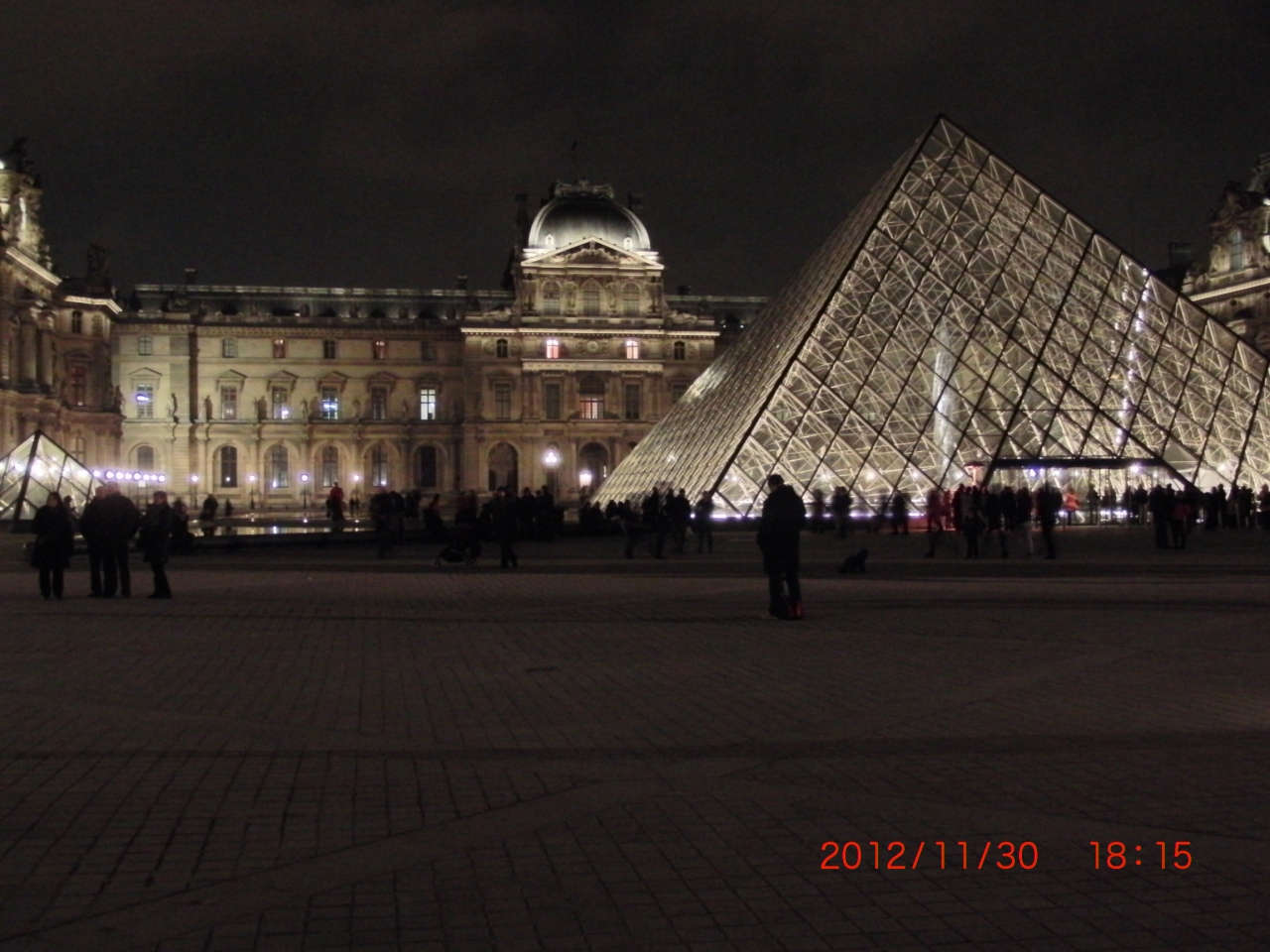 ルーブルの向かいにあるホテルで夕食後、19時からルーブルに見学に行きました。ルーブルは4回目で、夜に入ったのは初めてですが、こんなにもゆったりできるのかとびっくりしました。今まではツアーで入ったり、時間が短かったのと、なんといっても混んでる時間帯に行っていましたので、人が多くてゆっくり見学するという感じではありませんでした。ところがこの時間帯は、人もまばらで、説明員(学生なのか、みんな同じTシャツを着てました)の方が多いくらいです。いつもは有名どころしか見ないのですが、今回は今まで行ったことのない展示も見ることができ、ほんとうにルーブルを味わったという気がしました。スリにおびえることもなく、窓の外のガラスのピラミッドの美しさに見とれながら、うす暗く昼間とは別の空間のような趣のなか、満足して帰ってきました。