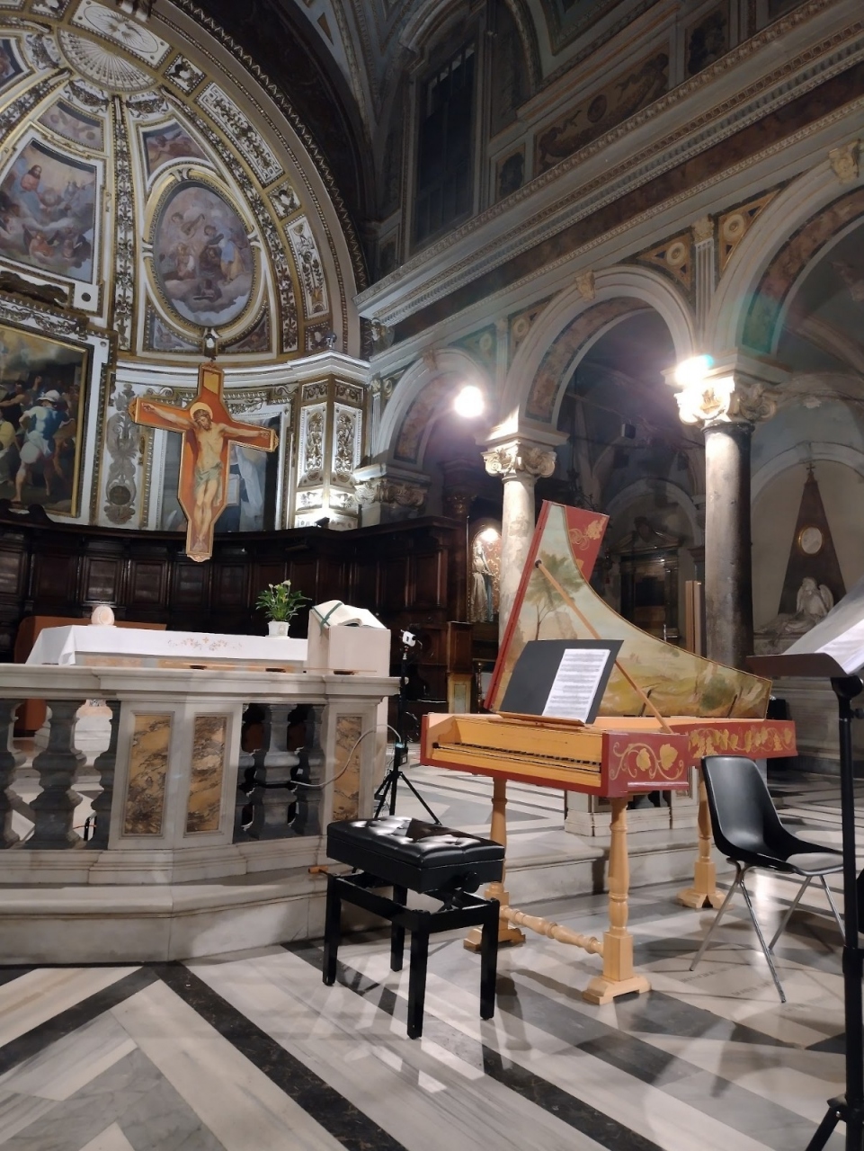 ローマで秋~冬に行われるバロック音楽祭の会場の一つでした。あまり有名な教会ではなく、住宅街や路地に囲まれた目立たないところにあるのですが、中は綺麗で、チェンバロ等バロック楽器がとても映えていました。協会ではこのようなコンサートが開催されることも多いので、おすすめです。