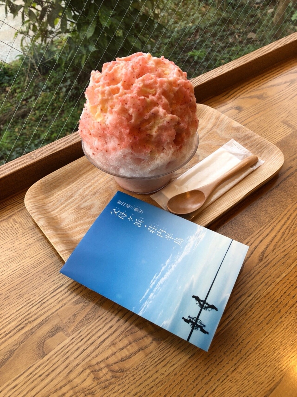 インスタ映えスポットから歩いてもいけたカフェ。ここはかき氷は有名なので少し寒かったけどオーダーしてみた。イチゴのかき氷。今まで食べた事ないくらい激うまでした。またここまで食べにきたいくらいの味。店内も可愛いカフェでした。