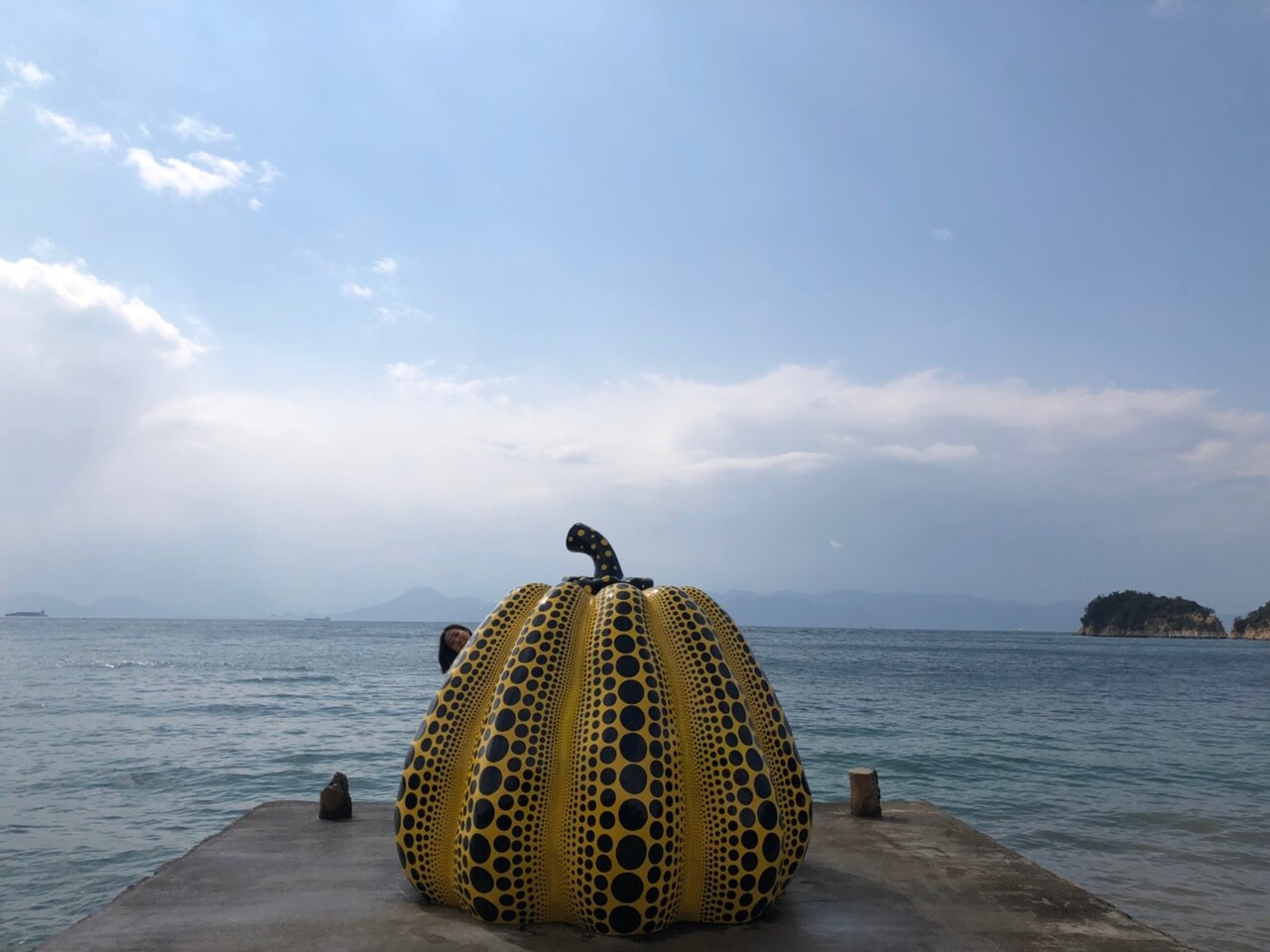 高松から直島へ行くフェリー。直島らしい柄のフェリーでした。結構大きくて揺れも少なく船酔いはしなかったです。このフェリーに乗ってついたらすぐ隣には赤い南瓜が待ってます!乗り場もお土産屋さんがあり、退屈はしないです。