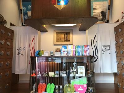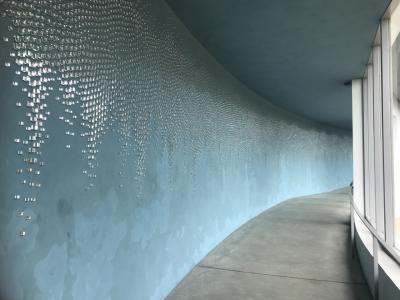 草間弥生の南瓜を過ぎるとあるアート群。それをすぎたらベネッセのホテルがあります。一階はお土産屋になっていて、そこから続く渡り廊下のキューブのガラスアートがとても綺麗でした。今度はぜひ泊まってみたいです。