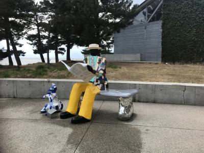 ベネッセのホテル前にはアート群がありますが、ホテル前にある新聞を読む男の人や鏡のアートもあり鏡のアートはお互いを撮りあったり大人でも楽しいエリアでした。大きな置物のアートはあまり詳しくないのですが、アートプロジェクトに囲まれたエリアでした。