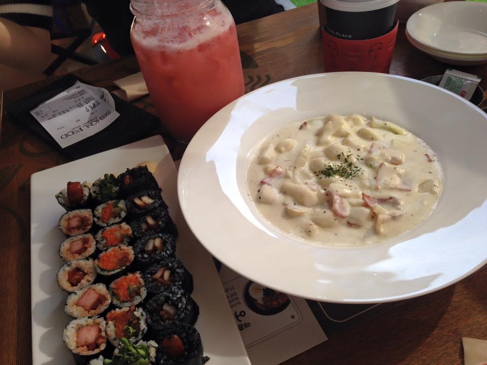 キムパ専門店のカロスキルにある店舗。少しまったけど二人だったので結構すぐ入れました。トイレが汚かったのが残念。キムパの色々な味が食べれるのは良かったのと、洋風のとっぽぎもあり。ドリンクは大きいスペシャルドリンクを二人で分けて飲みました。