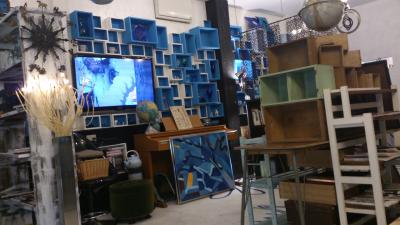 外観はちょっとはいりづらいですが、中にはいると意外と広くておしゃれな空間になっています。手作りぽい青いインテリアが個性的でした。フードメニューも充実し、夜遅くまで営業しているので夜カフェとして利用できます。